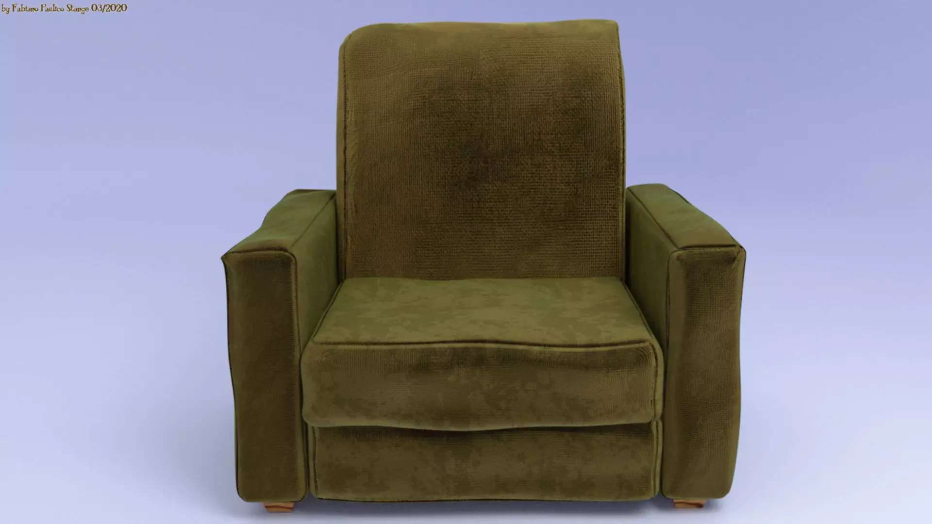 This couch model is an armchair style and was modeled using Blender version 2.79. This model consists of four graphic objects: the back, the seat, and the armrest were modeled using a cube mesh and a subdivision modifier for smooth details. Finally, the base was modeled using a cube mesh. There are three materials simulating the fabric material. It used standard shaders for PBR material. It can be used as the principle node. There is a material that represents a wood base. The textures are the diffuse map, the normal map, the bump map, the AO map, and the specular map