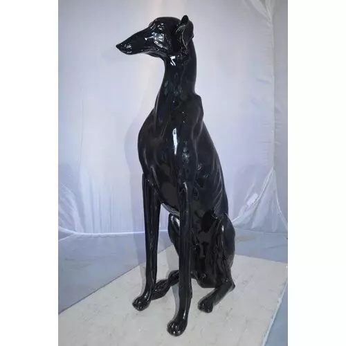 • This charming life-size resin statue depicts a beautiful greyhound dog sitting on the ground. The greyhound dog is a gentle and intelligent breed whose combination of long, powerful legs, deep chest, flexible spine, and slim build allows it to reach average race speeds exceeding 64 kilometers per hour.