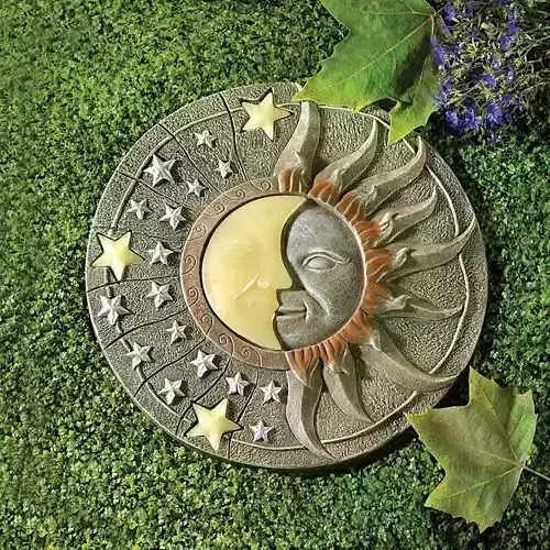 • Light up your front walkway or backyard garden path with this charming stepping stone. Showcasing a sun and moon pattern, this lovely piece is the perfect accent for any outdoor space.