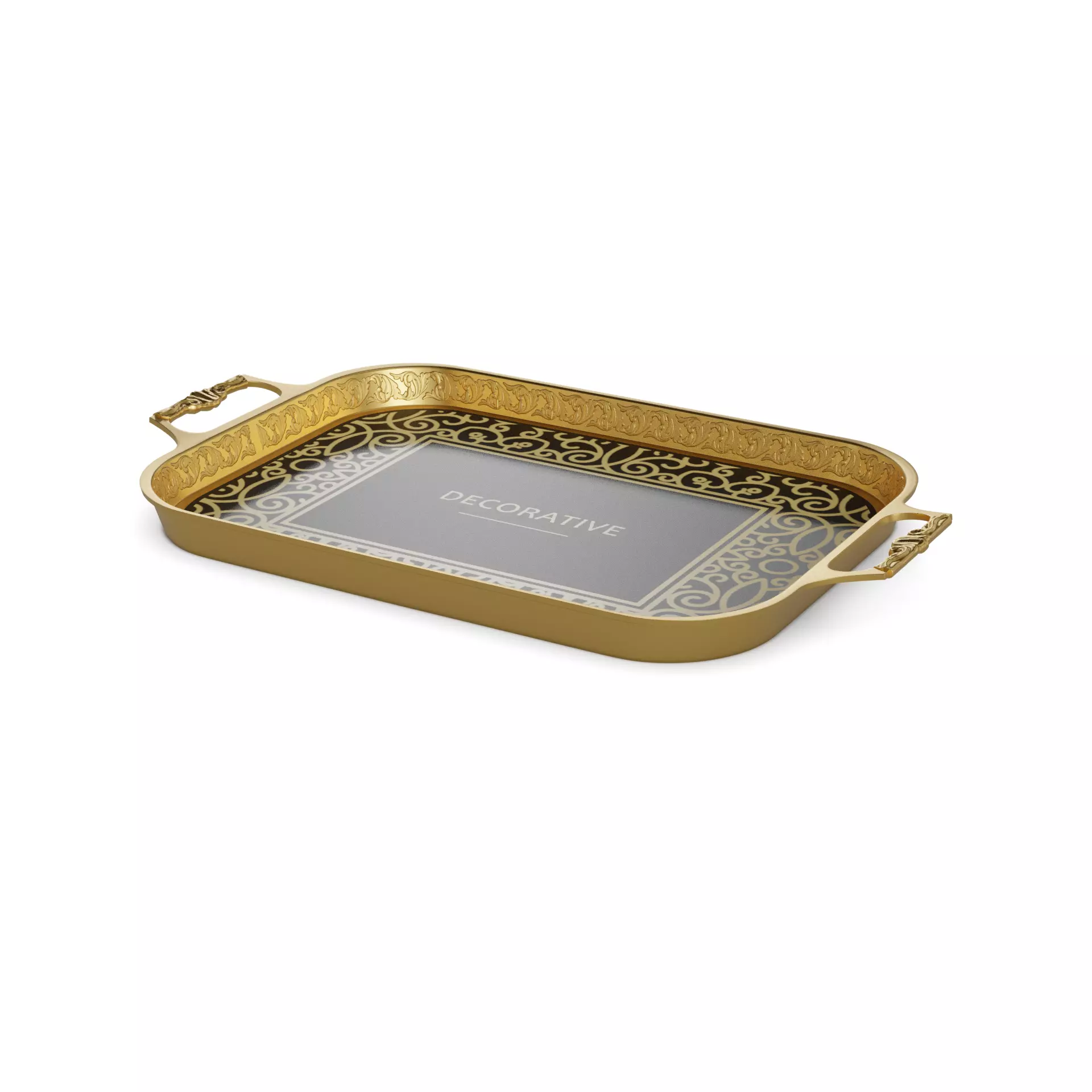 Decorative Tray: A versatile decorative tray that combines style and functionality. The tray is made of sturdy metal with a glossy gold finish, adding a touch of glamour to any space. It features intricate cut-out details along the edges, giving it an elegant and ornate look. The dimensions of the tray are 12x8 inches, making it perfect for displaying small decor items or serving drinks and snacks. The packaging is a rectangular cardboard box with a picture of the tray on the front. The box is predominantly black with gold accents, exuding a luxurious feel. A label on the packaging reads Gold Decorative Tray in fancy cursive font.