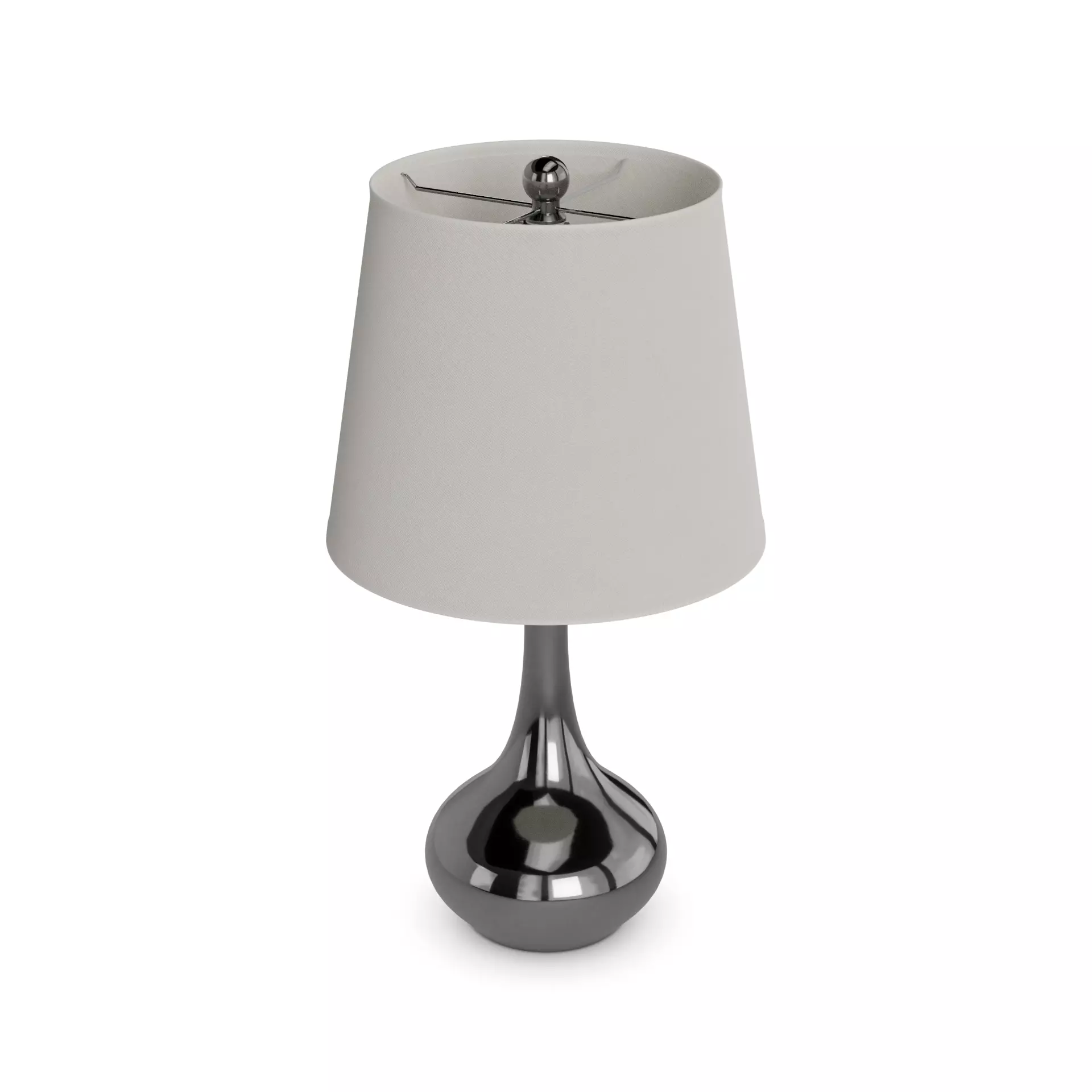 Table Lamp: A sleek table lamp with a chrome base and a white fabric shade. The packaging is a cardboard box with a cut-out design, revealing the elegant silhouette of the lamp. The label on the packaging includes the product name, dimensions, and a graphic of a well-lit room.