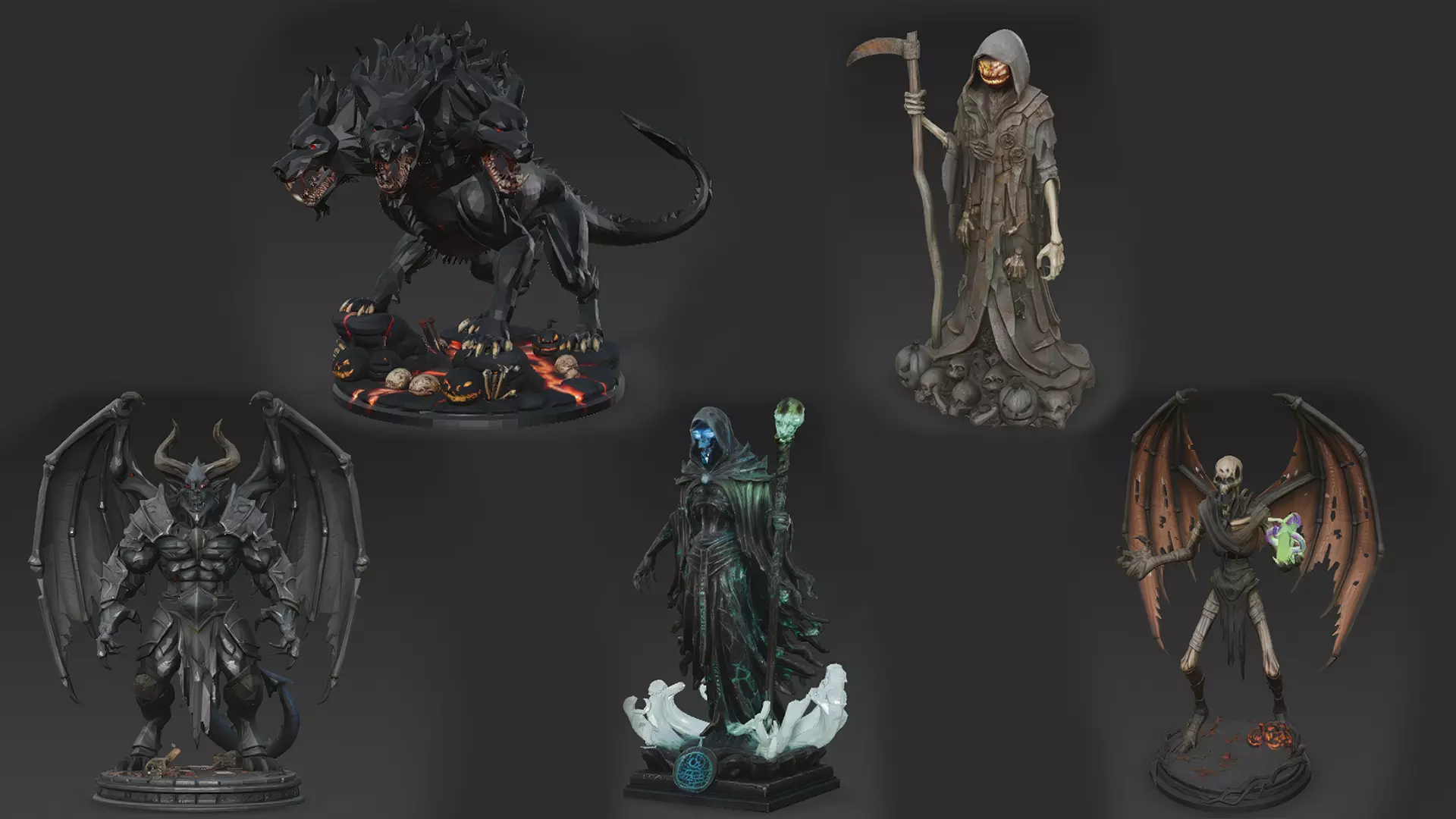 This Horror Statue Mega Pack includes five terrifying 3D models: a three-headed hellhound (Cerberus), a Grim Reaper, a demon, a ghost, and a skeleton.