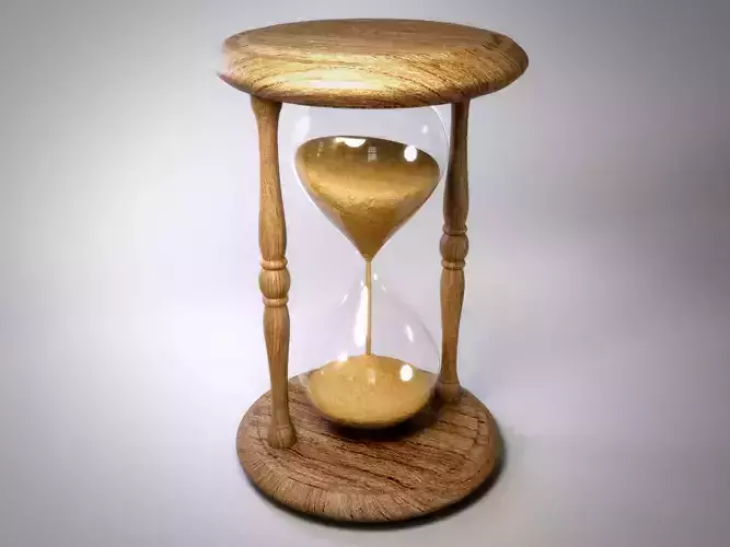 This meticulously crafted 3D hourglass embodies the passage of time through a harmonious blend of classic design and realistic detail. Featuring a turned wooden frame with a circular base and top, the model is supported by three elegantly sculpted columns. The clear glass bulbs contain fine sand mid-flow, capturing a moment of transition—perfect for visual storytelling, game environments, or cinematic renders