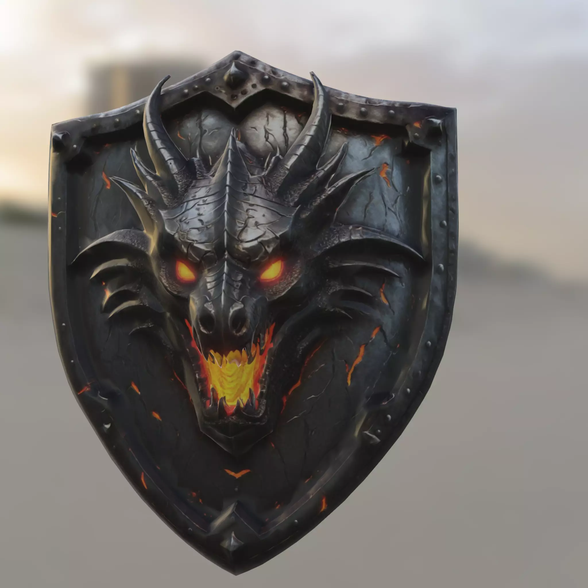 A highly detailed 3D model of a menacing shield featuring a roaring dragon head with molten lava cracks and glowing eyes. This asset is perfect for fantasy RPGs, dungeon crawlers, or PvP battle games such as Elden Ring, Skyrim, Dark Souls, Diablo, or World of Warcraft. It can be used as an epic boss reward, legendary armor equipment, or wall decor prop in cutscenes. Also optimized for 3D printing to create collectible miniatures or cosplay gear.