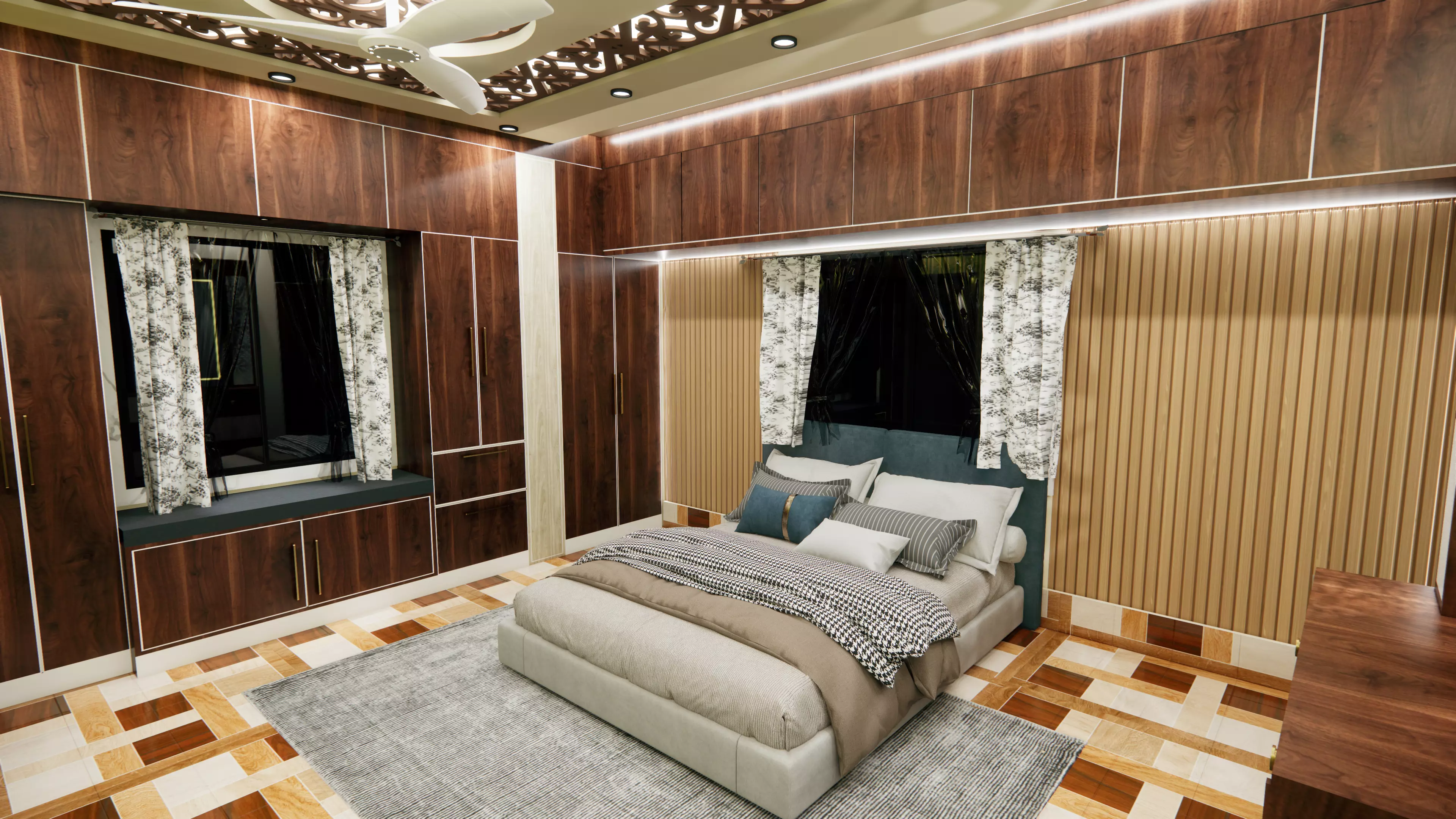 Textures and Materials:A variety of textures enhance the tactile experience of the space. The area rug beneath the bed is a plush, handwoven wool rug that adds warmth and softness underfoot. Velvet cushions and silk throws bring a sense of lavishness, while the dark wood flooring contrasts beautifully with the lighter tones in the room.