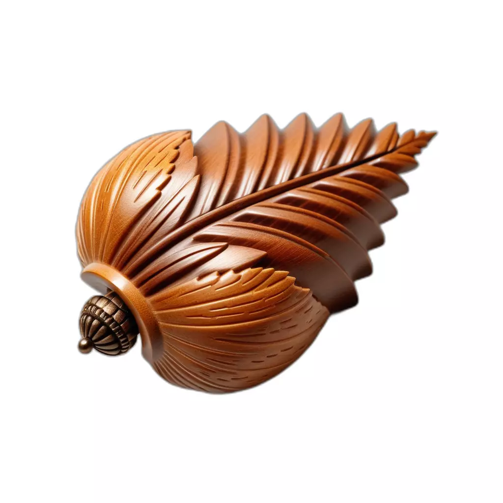This exquisite 3D model presents a highly detailed and beautifully crafted decorative wooden leaf ornament, featuring an intricate carving pattern and a stylized acorn-like base. The model meticulously captures the organic flow and textural richness of real wood, complete with realistic grain and subtle reflections, making it perfect for close-up renders. Its sophisticated design lends itself to a variety of creative applications, enhancing the aesthetic appeal of any digital scene.