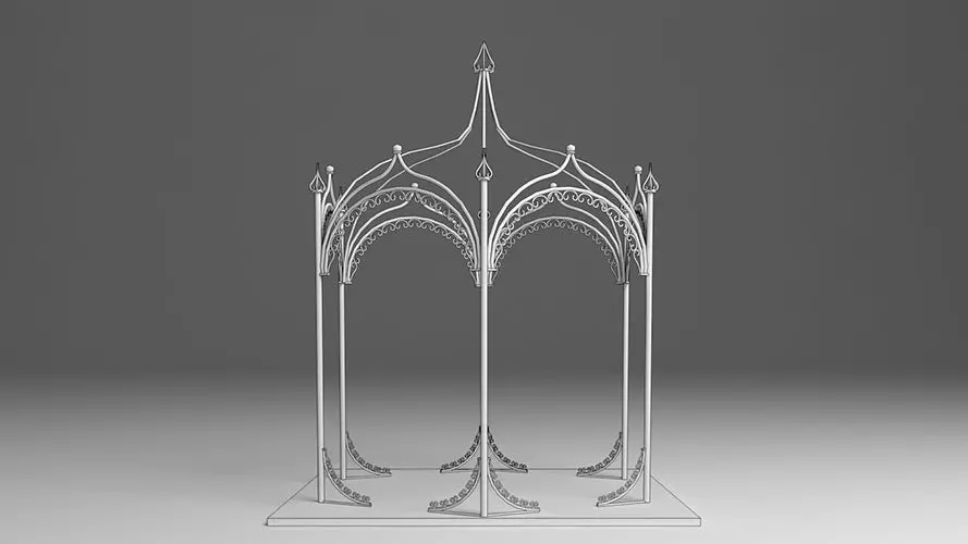This high-quality 3D model showcases a beautifully crafted iron canopy, perfect for architectural visualizations, garden scenes, or vintage-style environments. Designed with a classic wrought iron aesthetic, the canopy features elegant scrollwork, curved supports, and a metal lattice or open-frame roof, reminiscent of Victorian or ornamental industrial styles.