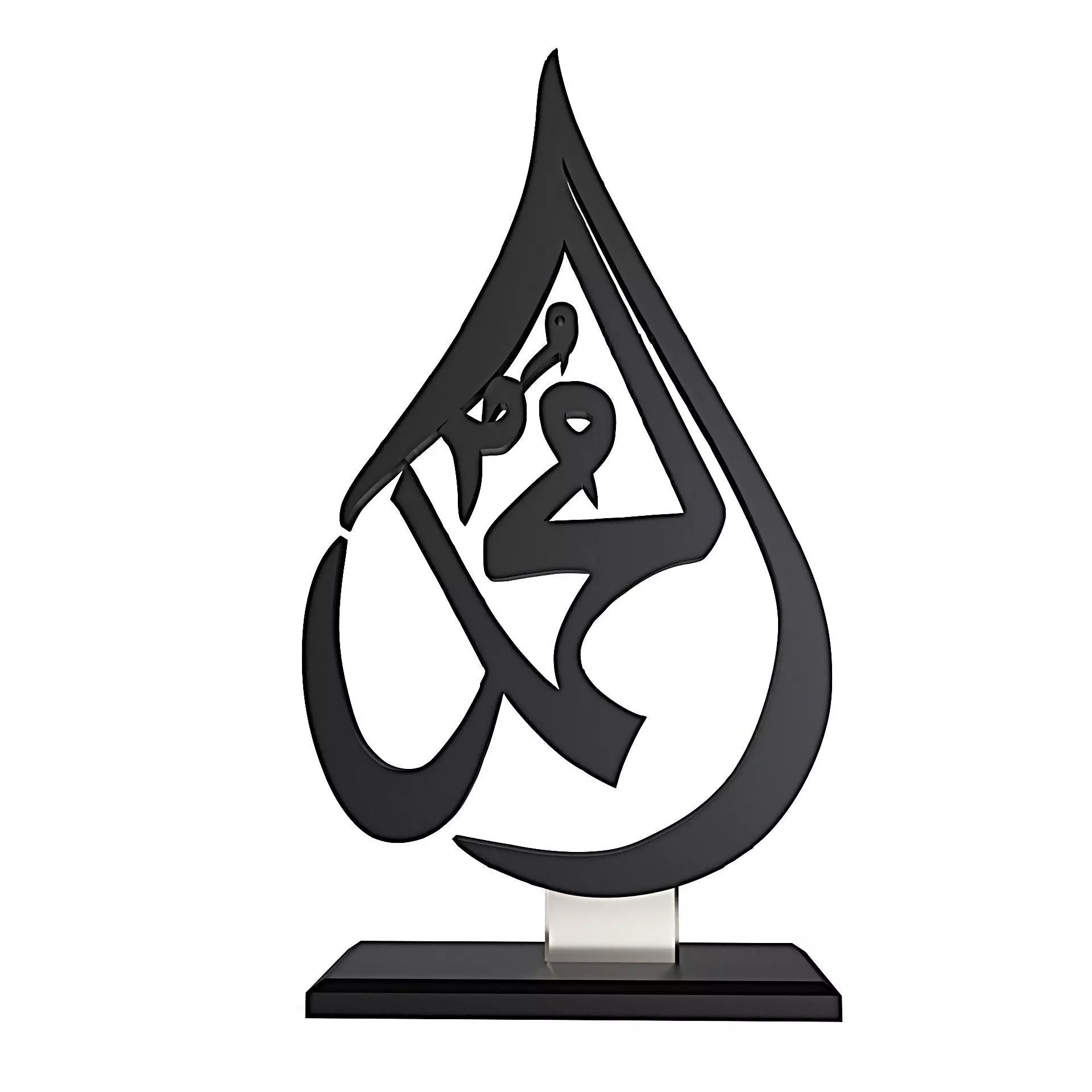 High-quality 3D model of an elegant Islamic Arabic calligraphy sculpture designed as a modern table decor piece. The artwork features a stylized teardrop-shaped frame with Arabic calligraphy inside, mounted on a minimal rectangular base. Suitable for interior visualization, Islamic decor scenes, product rendering, architectural presentations, and 3D printing.