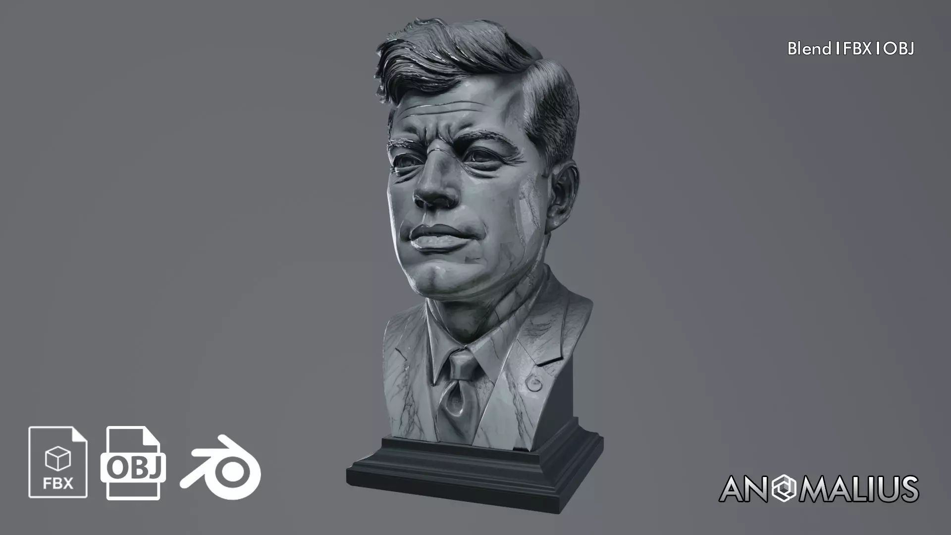 this JFK Portrait Bust is perfect for historical galleries, government office interiors, or academic environments. The model showcases expert digital sculpting, capturing the youthful and charismatic expression of one of the 20th century's most influential leaders. Designed with a clean, chiseled aesthetic, the bust sits upon a formal rectangular pedestal, making it an ideal decorative asset for library shelves, mahogany desks, or museum exhibits. This asset is game-ready and professionally optimized, provided in blend, fbx, and obj formats