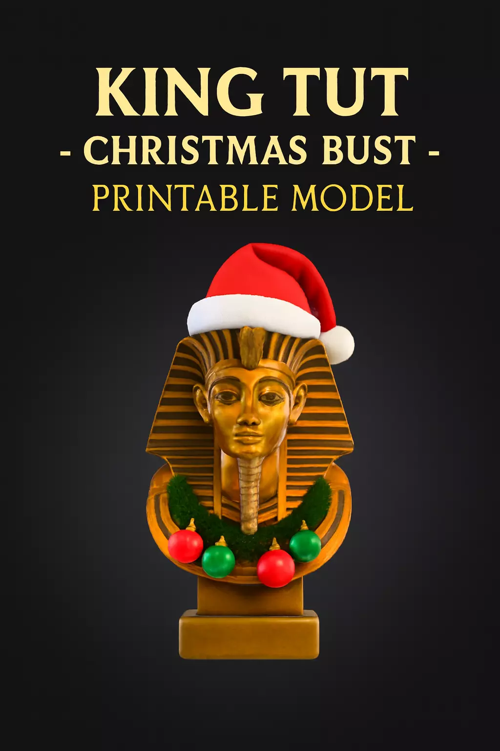 This unique 3D model blends ancient Egyptian royalty with festive holiday cheer. It features a golden bust of Pharaoh Tutankhamun, inspired by his iconic funerary mask, reimagined with joyful Christmas decorations.