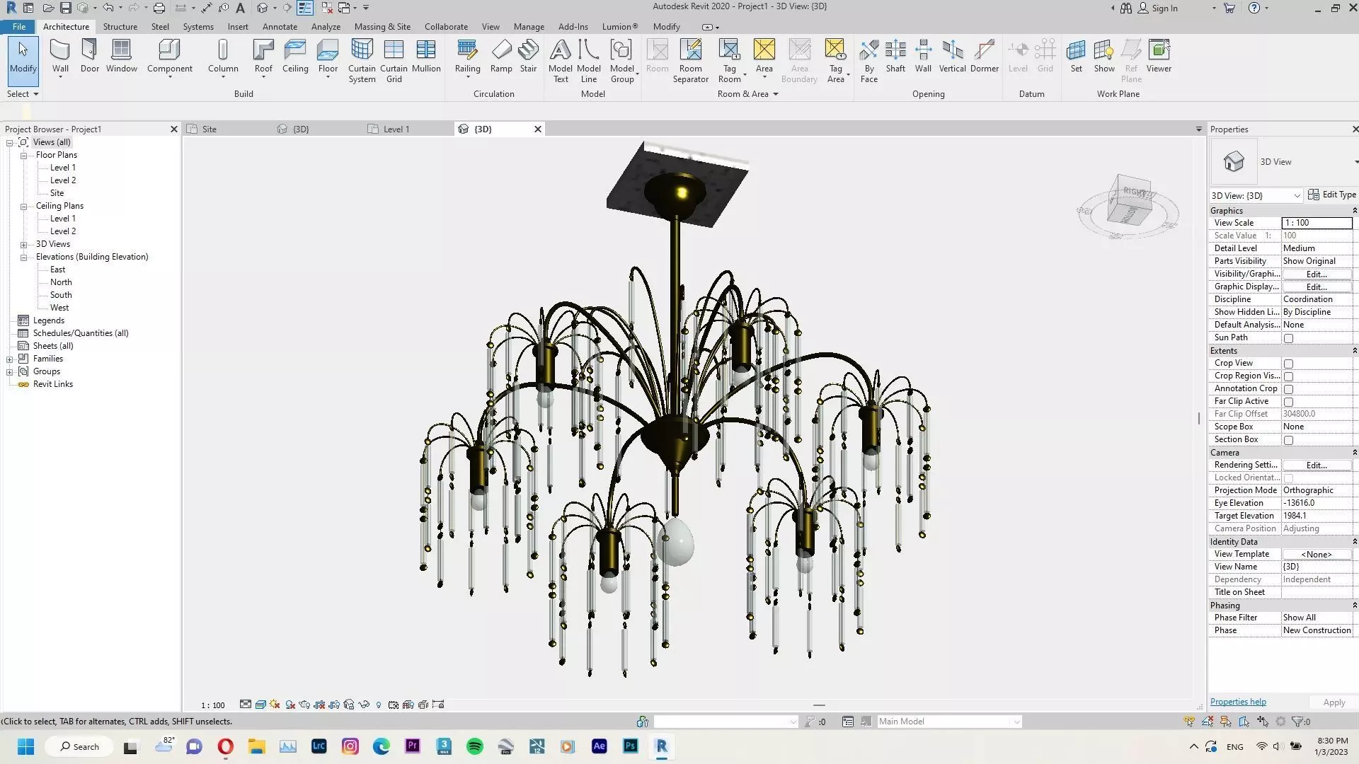 The model has material settings that define how surfaces look (color, shine, transparency, etc.).