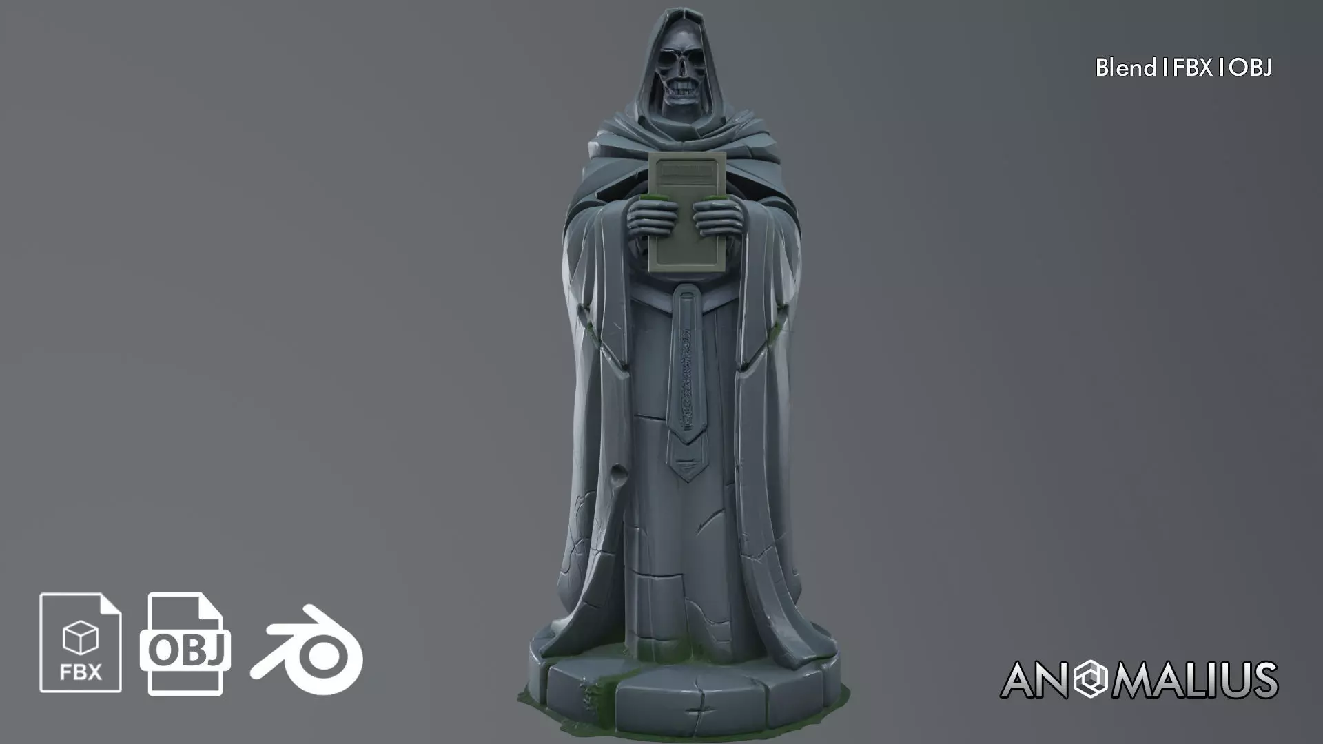 Stylized lich statue designed for games and real-time environments. The model depicts a hooded skeletal sorcerer holding an ancient book, standing on a stone pedestal with subtle aged details. Suitable for fantasy, dungeon, dark magic, or gothic-themed scenes in indie and mobile games