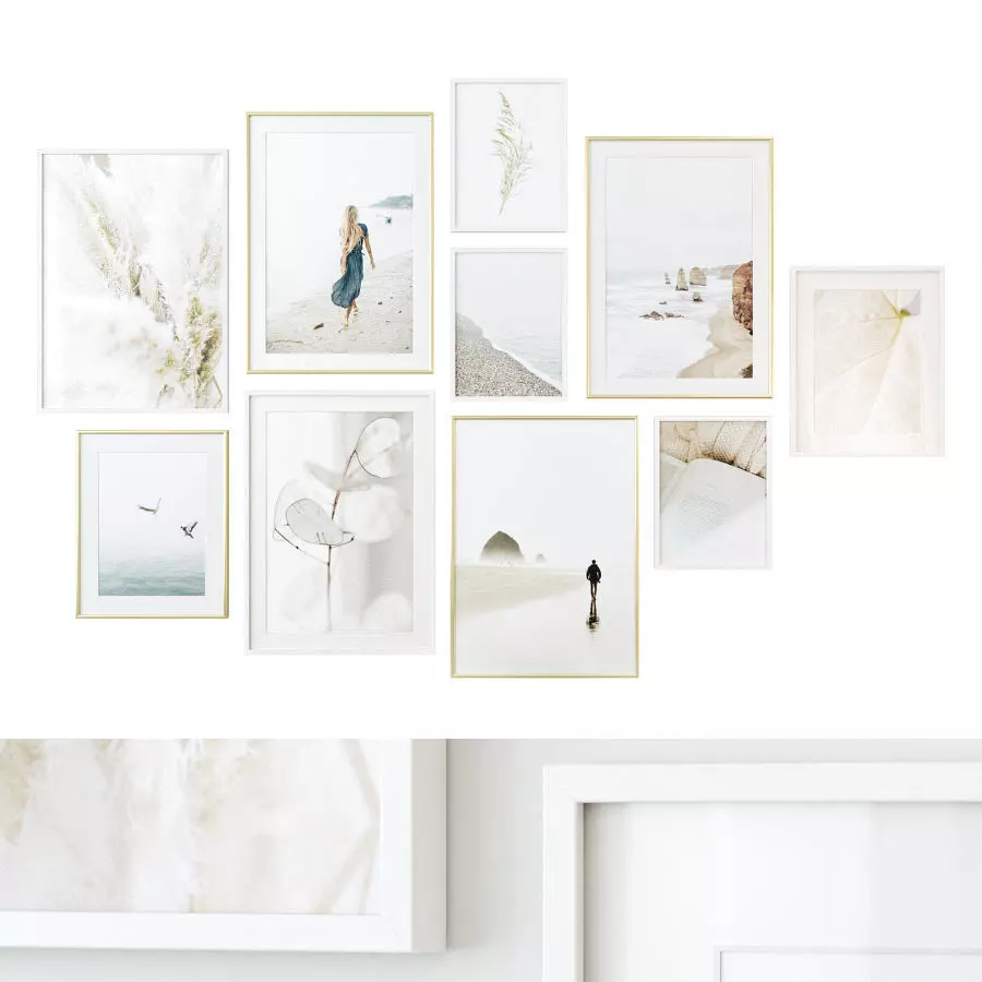 A gallery wall in soft neutral hues in white wooden and gold frames.