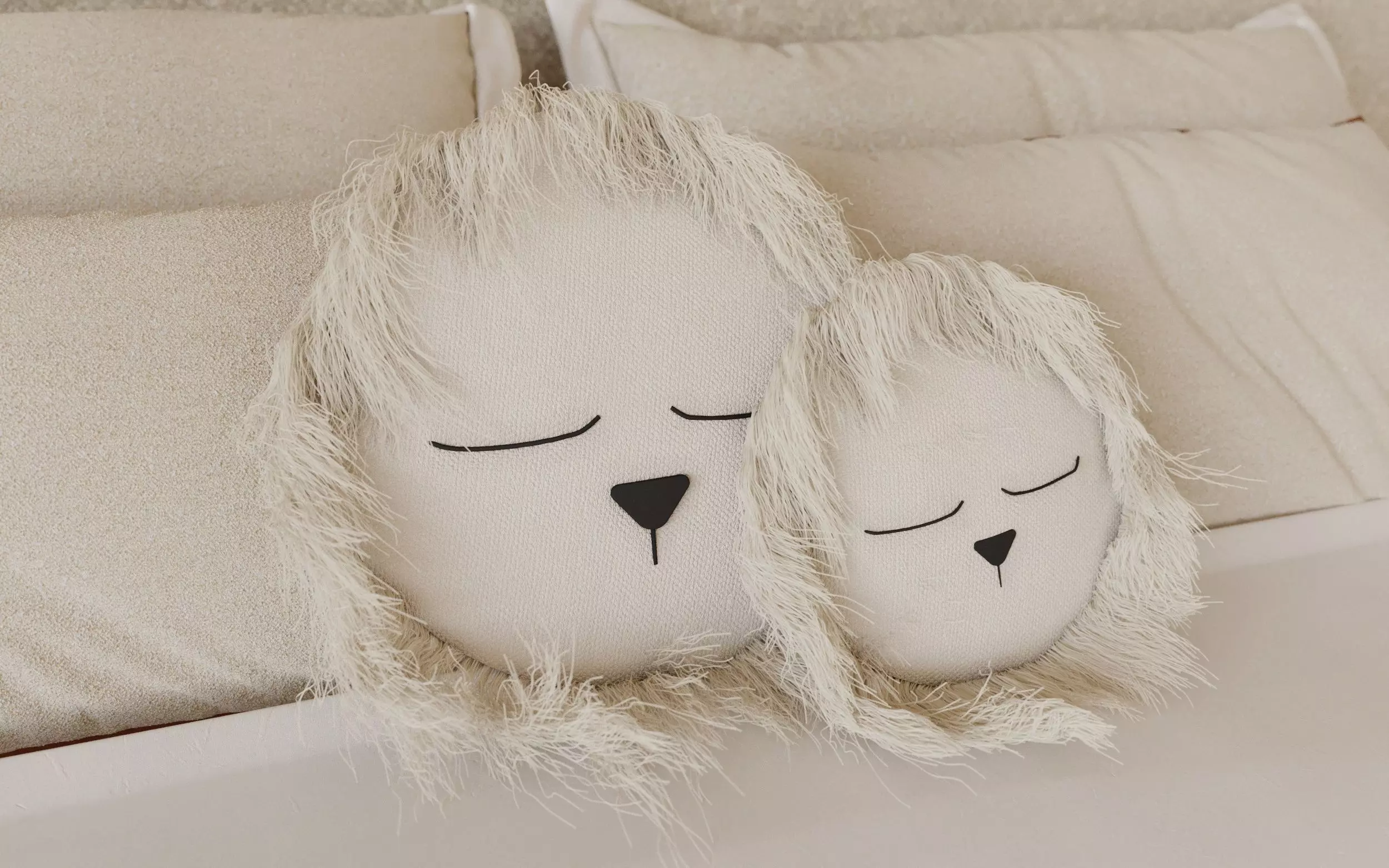 3D model of a handmade crochet cushion, made by Ila y Ela. The cushion is made of thick upholstery fabric with rugged and natural appearance and embroidered eyes.Mesh is a simple object with 3ds max Hair and Fur modifier applied for the lion mane. No post-process was done on the preview images.