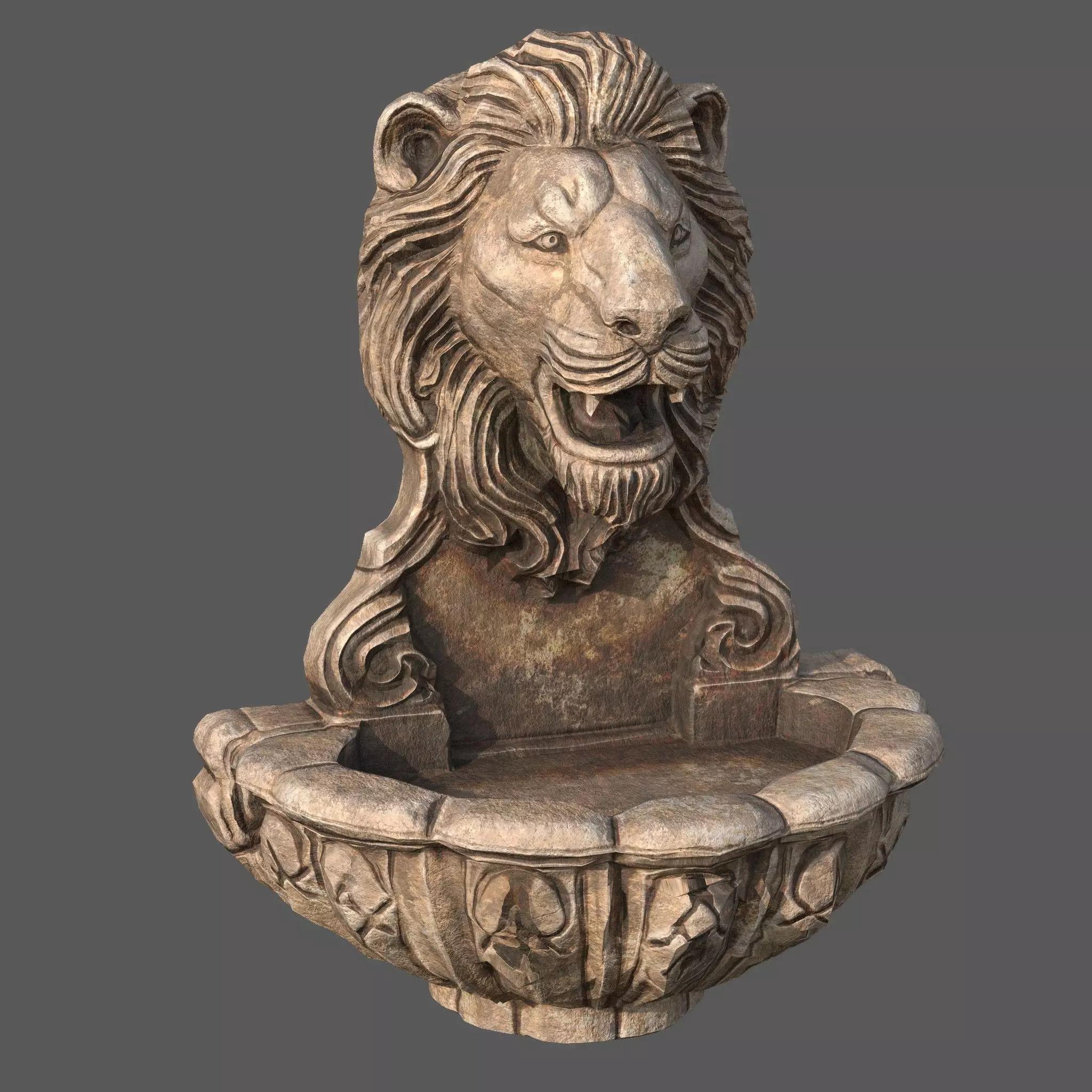 Lions Fountain Majesty is a highly detailed 3D model of a classic stone wall fountain featuring a majestic lion head sculpture.