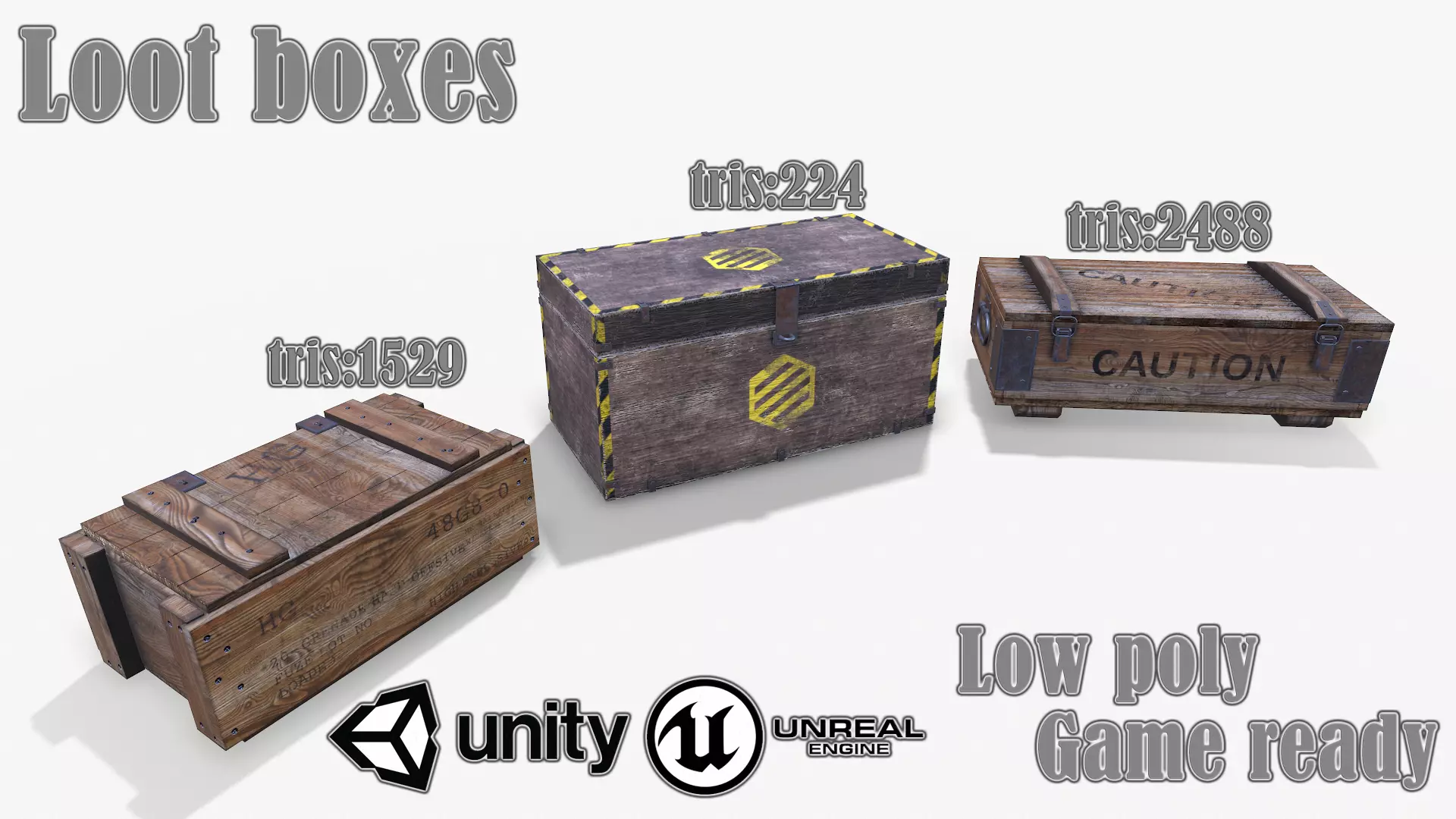 ZIP included file formats: -mb -fbx -dae -obj -TGA Low poly: 1529 tris, 224tris, 2488tris TEXTURES: Loot boxes Wooden AO Loot boxes Wooden DM 02 Loot boxes Wooden HM 02 Loot boxes Wooden MM 02 Loot boxes Wooden NM 02 Loot boxes Wooden RM 02 (4096x4096) The scene was modeled with Autodesk Maya 2018. All objects are grouped and named correct for easily selections and management. No special plug-in needed to open the scene. Entire scene was modeled at real scale. This model is scaled to real world. Units of measurement: centimeters. All materials named correct. Model include game-ready texture. Very easy to work it.