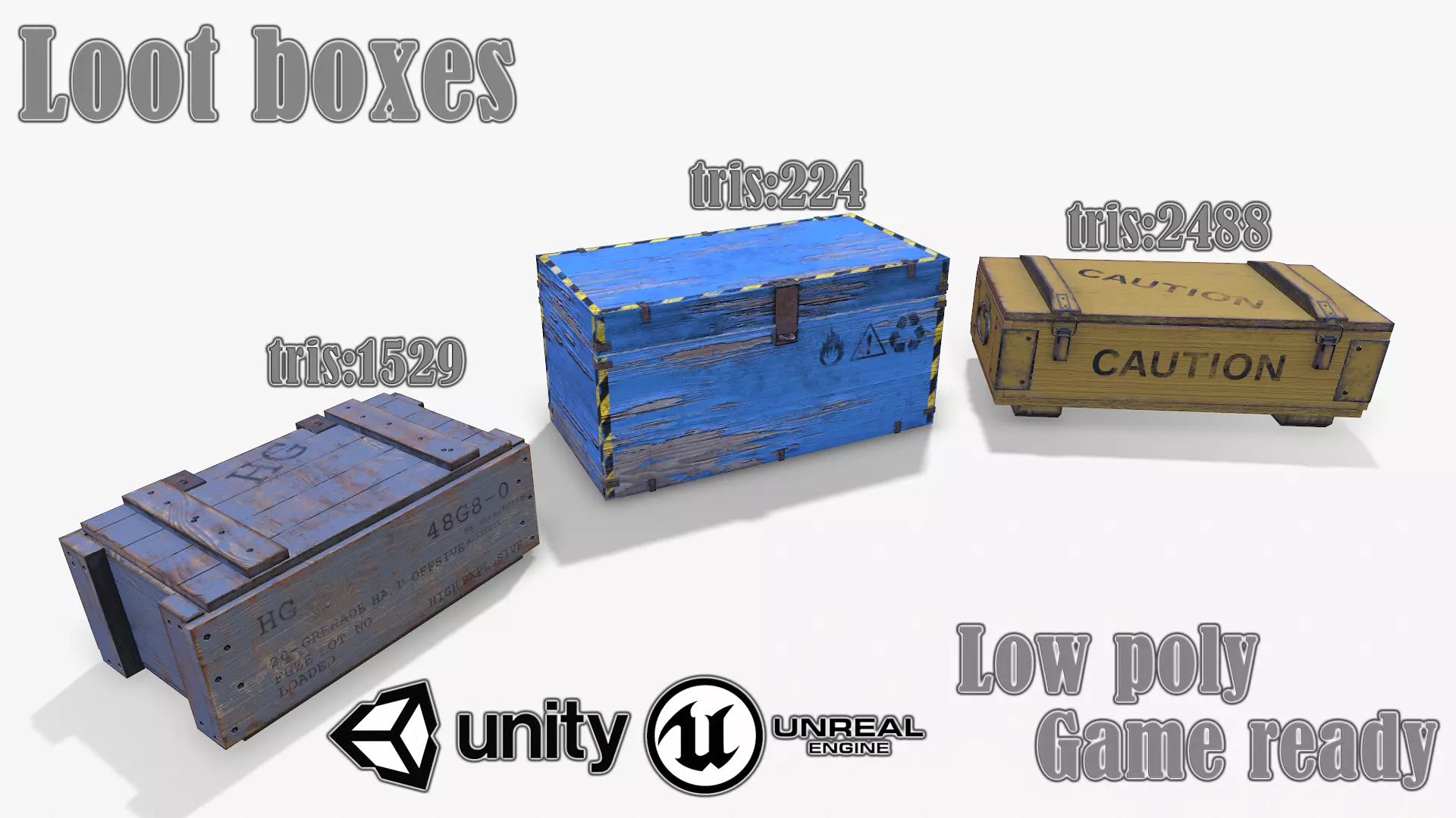 ZIP included file formats: -mb -fbx -dae -obj -TGA Low poly: 1529 tris, 224tris, 2488tris TEXTURES: Loot boxes Wooden AO Loot boxes Wooden DM 03 Loot boxes Wooden HM 03 Loot boxes Wooden MM 03 Loot boxes Wooden NM 03 Loot boxes Wooden RM 03 (4096x4096) The scene was modeled with Autodesk Maya 2018. All objects are grouped and named correct for easily selections and management. No special plug-in needed to open the scene. Entire scene was modeled at real scale. This model is scaled to real world. Units of measurement: centimeters. All materials named correct. Model include game-ready texture. Very easy to work it.