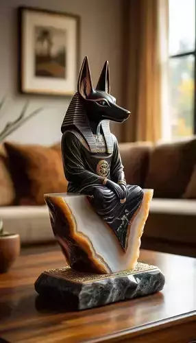 The entire piece rests on a dark, veined marble base with golden inlays, grounding it in luxury and stability. The lighting accentuates the glossy finish of the black surface, the metallic sheen of the gold accents, and the luminous glow of the geode’s interior, creating a mesmerizing interplay of light, color, and form. Placed on a wooden coffee table in a cozy living room setting, the statue serves as a striking centerpiece that bridges ancient mysticism with contemporary design.
