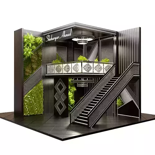This is a luxurious double-height 3D exhibition booth ideal for showcasing premium brands, digital art, interior design, or real estate presentations. Built entirely in Blender, the model includes intricate architectural elements, greenery walls, and an elegant staircase leading to a mezzanine level — giving it a modern and high-end appearance.