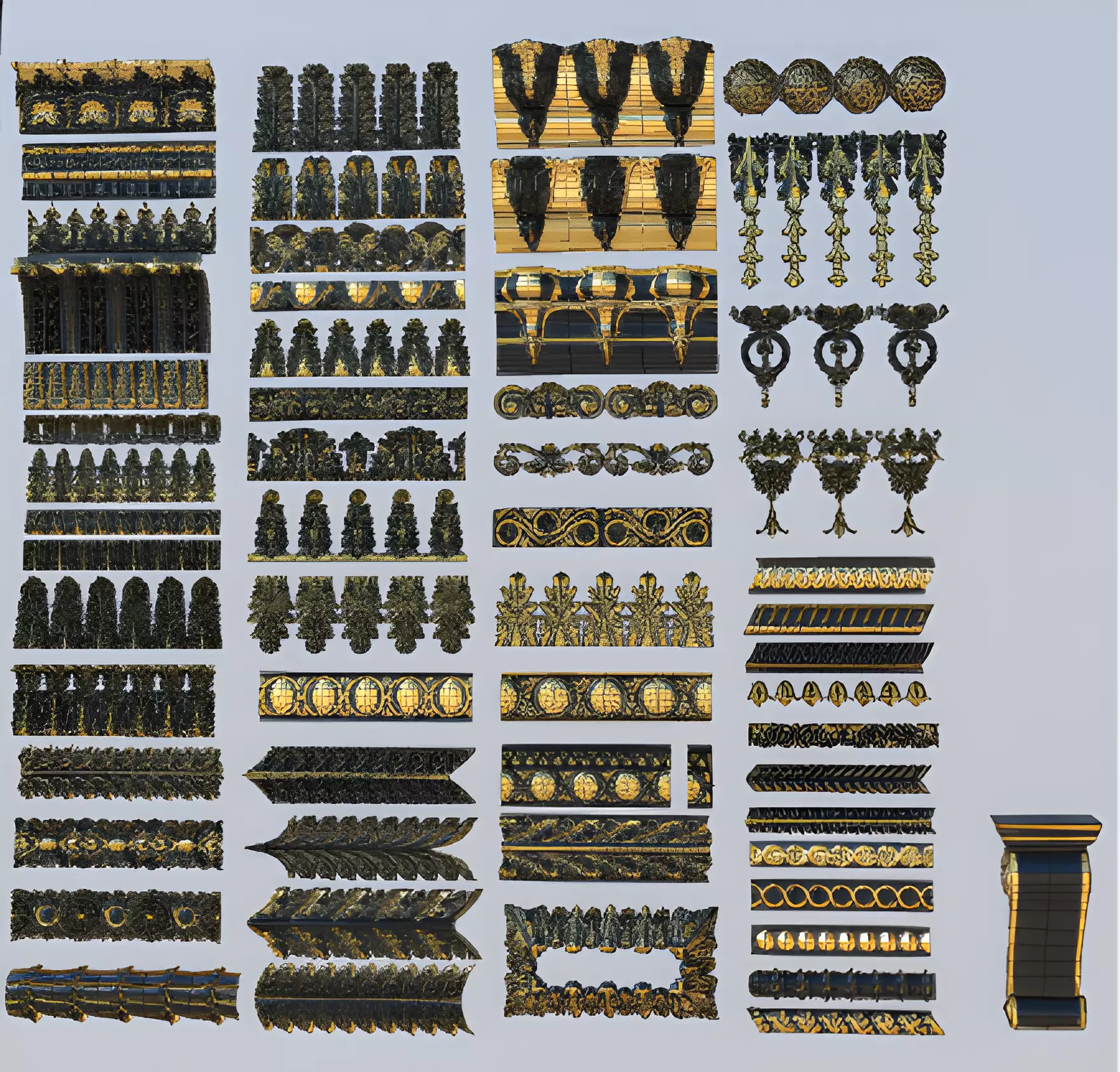 This 3D collection showcases an extensive range of luxury ornamental friezes designed with exquisite detail and a blend of classical and baroque aesthetics. Featuring golden and black finishes, each frieze exhibits intricate floral motifs, geometric patterns, and regal embellishments that elevate architectural and design projects. The models are crafted with precision to highlight ornamental richness, making them suitable for both interior and exterior decorative applications. Perfectly optimized for use in 3D rendering, visualization, and architectural design, these friezes add elegance and sophistication to digital and physical creations.