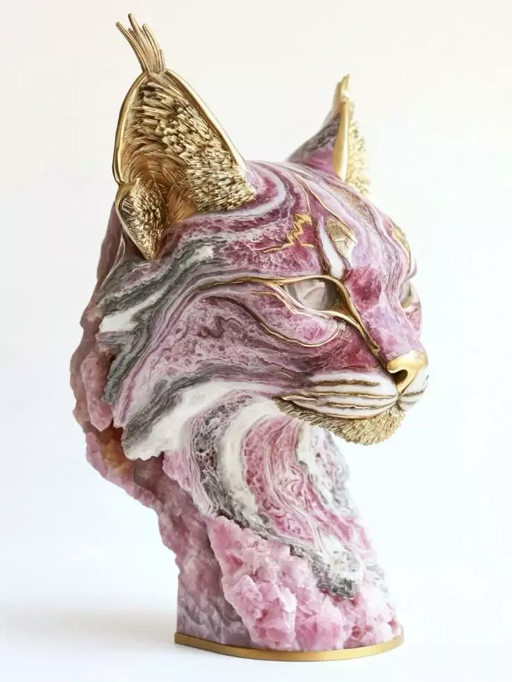 Exquisite 3D model of a stylized cat head sculpture crafted from vibrant pink and white marble with intricate veining, accented with elegant gold detailing. The feline features a majestic, regal profile with sharp, expressive eyes outlined in gold leaf, golden ears with textured fur-like patterns, and a delicately gilded nose and whiskers. The base of the sculpture transitions into a natural crystal formation, resembling raw rose quartz, adding a touch of organic luxury and depth. This artistic piece blends realism with fantasy, capturing the grace and mystique of a mythical creature. Perfect for use in high-end interior design, art installations, fashion presentations, or as a decorative collectible. The 3D model includes detailed PBR materials—albedo, roughness, metallic, normal, and emissive maps—for photorealistic rendering in Blender, Maya, 3ds Max, Unreal Engine, or Unity. Ideal for digital artists, designers, and creators working on concept art, product visualization, or luxury branding. Optimized for both real-time and cinematic applications, this asset features clean topology, precise UV mapping, and realistic lighting response. A stunning fusion of nature, craftsmanship, and modern aesthetics, suitable for showcasing in galleries, retail displays, or as a unique statement object in virtual environments. A must-have for those seeking bold, artistic, and visually captivating 3D content.