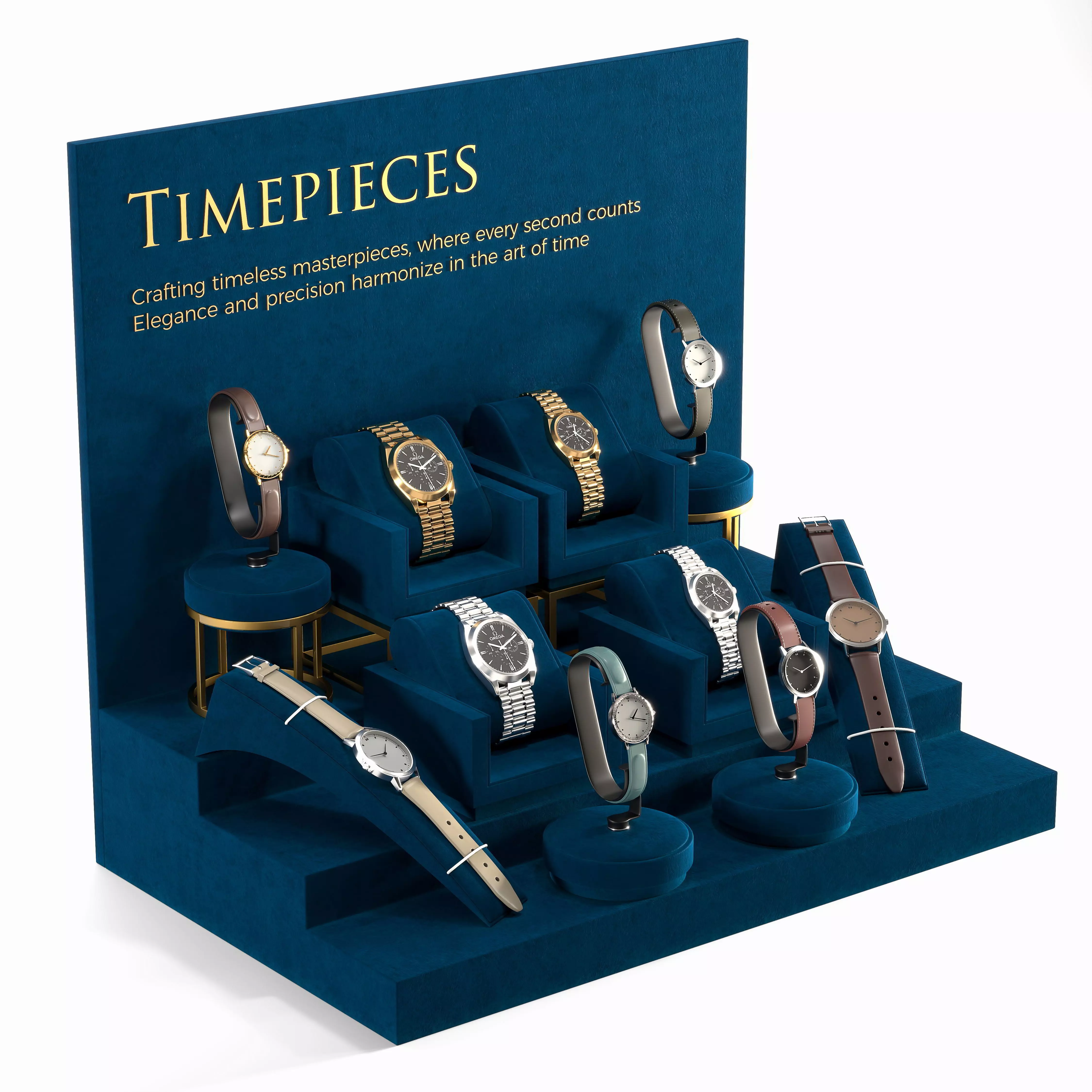A high-end watch display stand with a deep blue velvet finish and brushed gold accents. Designed to hold 6-10 watches, perfect for luxury boutiques and product showcases.