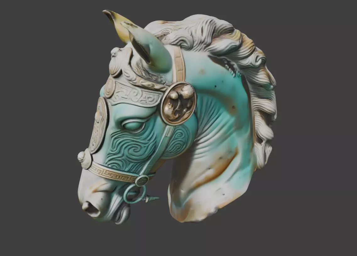 Decorative elements enhance the ceremonial character of the bust. Ornamental harness details, stylized textures, and refined surface treatment suggest craftsmanship rooted in classical sculpture traditions. Whether interpreted as stone, metal, or polished ceremonial material, the surface carries a sense of age, prestige, and cultural importance. This makes the bust suitable for both historical interpretations and fantasy-inspired worlds where horses represent power and legacy.