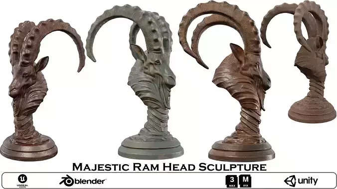 Name: Majestic Ram Head SculptureType: modelFormat: 3Ds Max 2013Export: FBX, OBJRender: VRay (5.x), Corona (9)Polys: 14583Verts: 14491Matclasses: VRayMtl,_CoronaPhysicalMtlUnits: CentimetersDimension: 80.94 x 55.66 x 99.94Date: 2025.9.10
