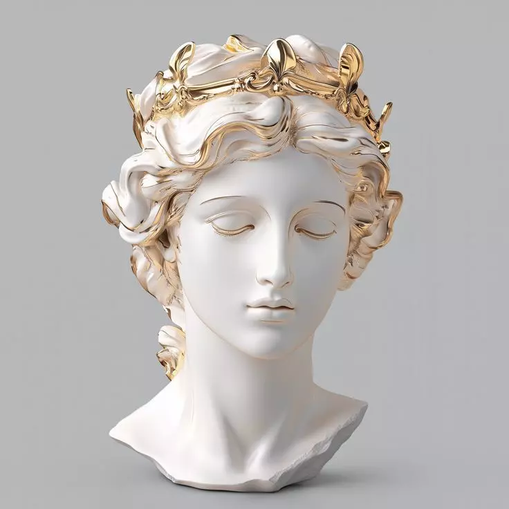 Crowning her head is an ornate golden diadem adorned with fleur-de-lis motifs, leaves, and swirling patterns, adding a touch of regal splendor and symbolic meaning. The gold accents contrast beautifully with the pure white marble, highlighting the craftsmanship and elevating the bust to a status of mythological or royal significance. The crown’s reflective surface catches light subtly, enhancing its luxurious presence while maintaining harmony with the overall composition.