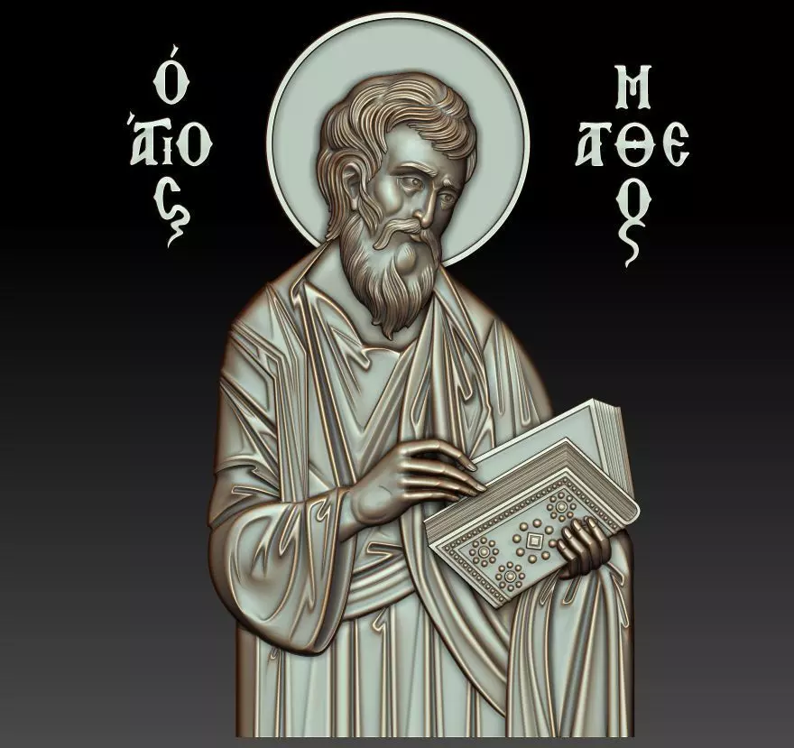 3d model Orthodox icon of Matthew the Evangelist (Matthew the Apostle, Apostle Matheos). For milling on CNC machines. Can be used in the production of souvenirs, furniture, jewelry. Files in stl format, for import to artcam, rhinoceros, 3ds max, etc. You can scale the model to any size you need.