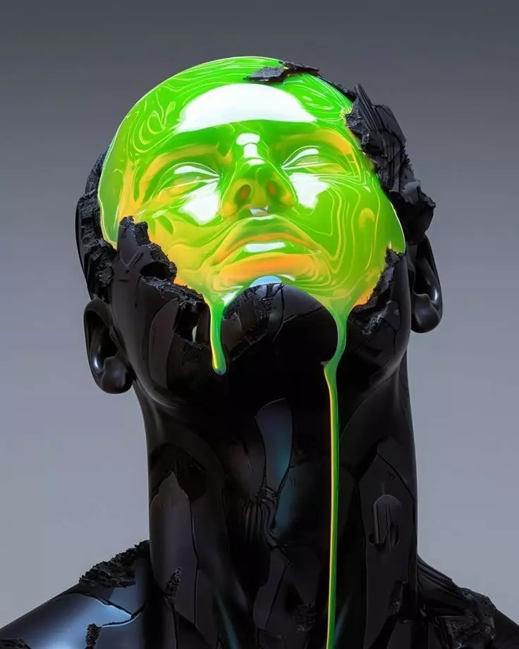 Ultra-realistic 3D model of a surreal, sci-fi sculpture depicting a human head undergoing a dramatic transformation. The figure is rendered in sleek, matte black material—resembling carbon fiber or polished metal—with a cracked, fragmented surface that reveals a vibrant, glowing green liquid oozing from within. This viscous substance flows across the face, distorting facial features into fluid, wavy patterns before dripping down the neck and chest in a continuous stream.