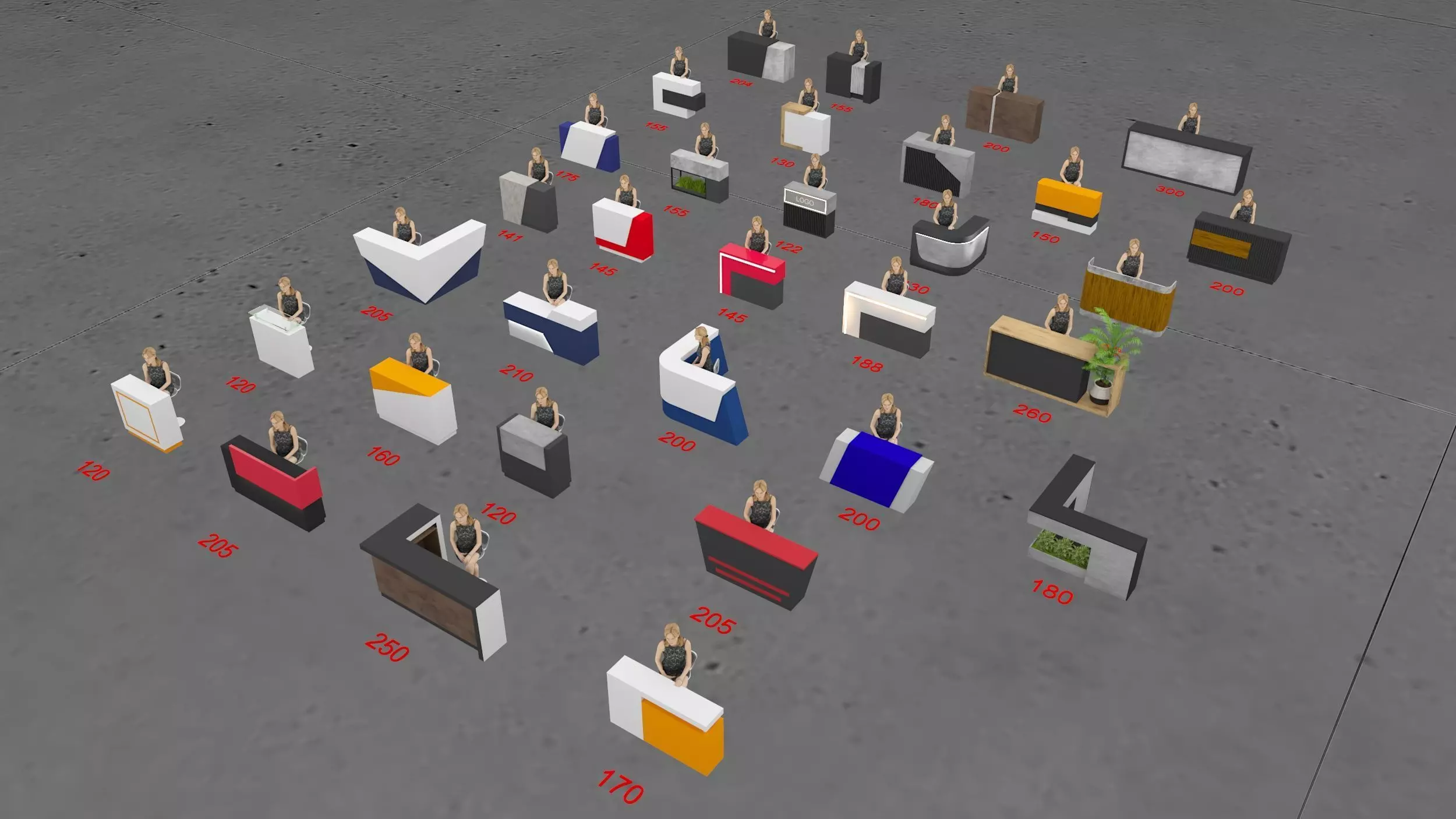 This collection includes modern exhibition reception counters designed for trade fairs, corporate booths, and event spaces.Each model features elegant curves, decorative plant details, LED light accents, and vibrant color combinations that bring a realistic and professional look to any scene.
