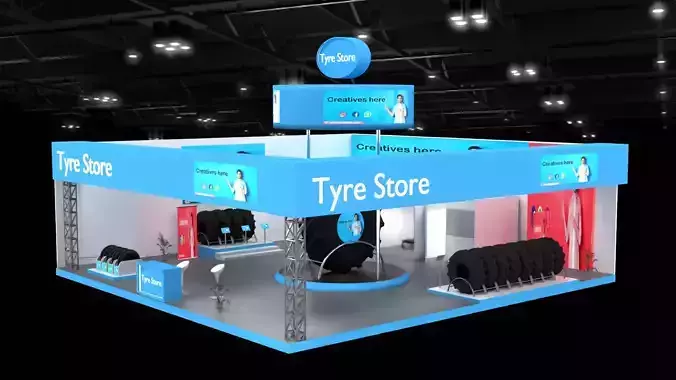 Rendered using Blender 4.3, this visually striking tyre store booth is built to real-world scale, designed specifically for automotive expos or dealership presentations. A bright blue branding theme dominates the structure, with a strong overhead fascia and floating circular top signage for enhanced brand visibility. Bloom effects in the lighting highlight the structure’s vibrant, commercial appeal. Strategically placed tyre racks and digital screens enhance product interaction. Realistic image textures are applied across the booth—from tyres to banners—for a polished, real-life presence.