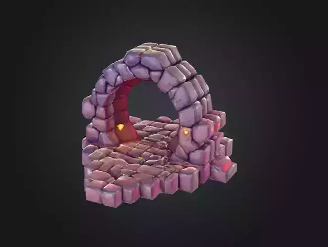 Built with modular precision and artistic flair, the stone surfaces display hand-painted textures with subtle gradients of violet and magenta hues, while the warm internal glow adds contrast and atmosphere. The cobblestone floor beneath the archway is slightly uneven, adding depth and realism to the environment. Small glowing gems embedded in the stones hint at a magical source of power or ancient civilization that once used the structure.