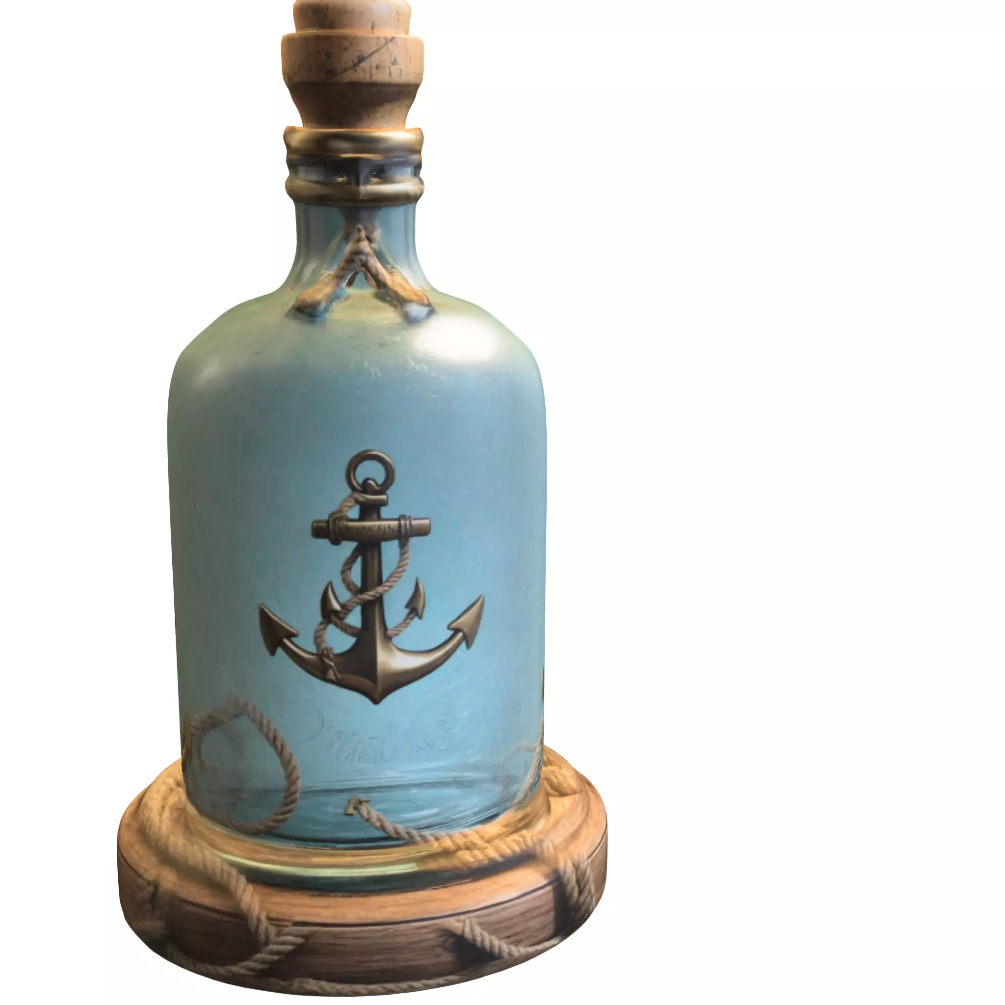 This high-quality 3D model showcases a maritime-style glass bottle adorned with an engraved anchor and coiled rope detail, sealed with a cork and placed on a wooden base. Ideal as an in-game decorative asset or collectible in adventure, pirate, or nautical-themed games such as Sea of Thieves, Skull and Bones, Raft, or Assassin’s Creed IV: Black Flag. It’s also optimized for 3D printing as a physical ornament or tabletop prop.