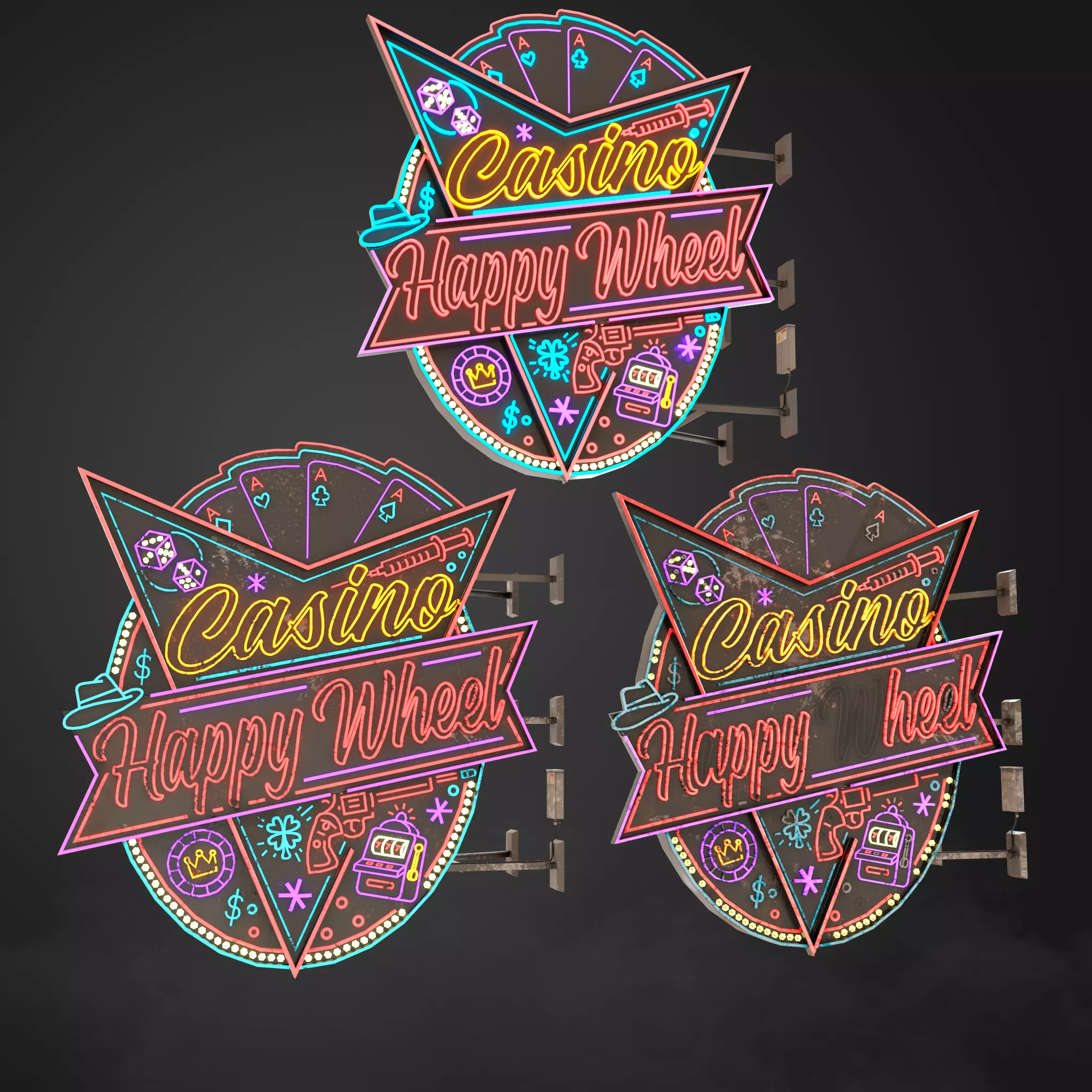 Neon sign (billboard) Casino in the style of 60-80 years. This model is made in 3 types: whole, rusty and old. the 3d model of the signboard is made in low poly and has 2 packs of PBR textures for each type of model. Each model contains:Vertexes: 20.200Triangles: 13.299