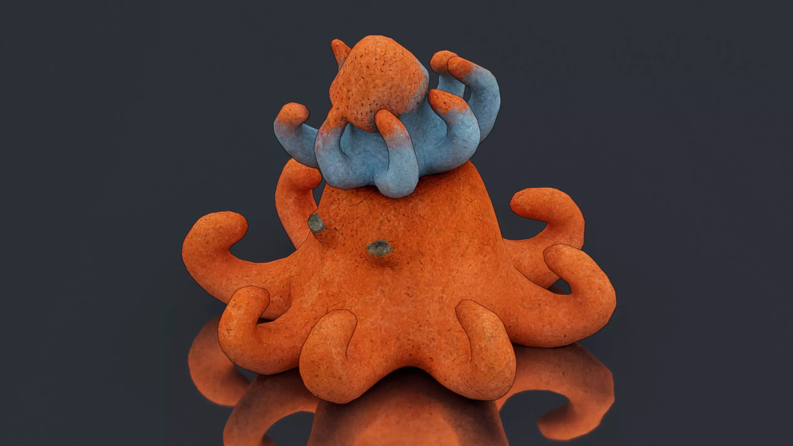This whimsical 3D low-poly model depicts a charming octopus sculpture, featuring a robust orange base creature with textured, clay-like tentacles curling dynamically, topped by a smaller blue-gradient companion perched playfully on its head like a curious offspring or whimsical hat. Rendered in a stylized, minimalist aesthetic with subtle reflections on a dark surface, it evokes a sense of underwater fantasy and artistic whimsy, perfect for digital art, animation, or collectible designs.