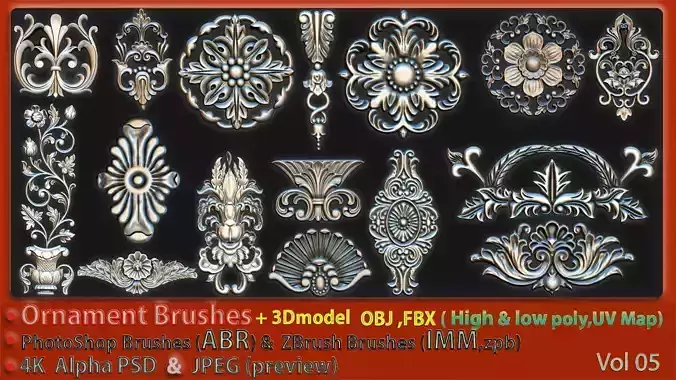 66 Ornament Brushes + 3D Model + IMM Brush Vol 05This Product includes 66 Ornament alpha/brush sets for ZBrush, Substance Painter, Photoshop, Quixel DDO and NDO etc.These brushes can be used for any program that works with alphas and height maps, you can add them to 3Dcoat, 4Dcinema, Blender etc.info about this Product :66 Brushes4K ( 4096x4096)16 BitZbrush Brush, IMM , ABR , PSD , OBJ , JPEG (preview)Photoshop Brush ABR3dmodels OBJ-FBXNote :