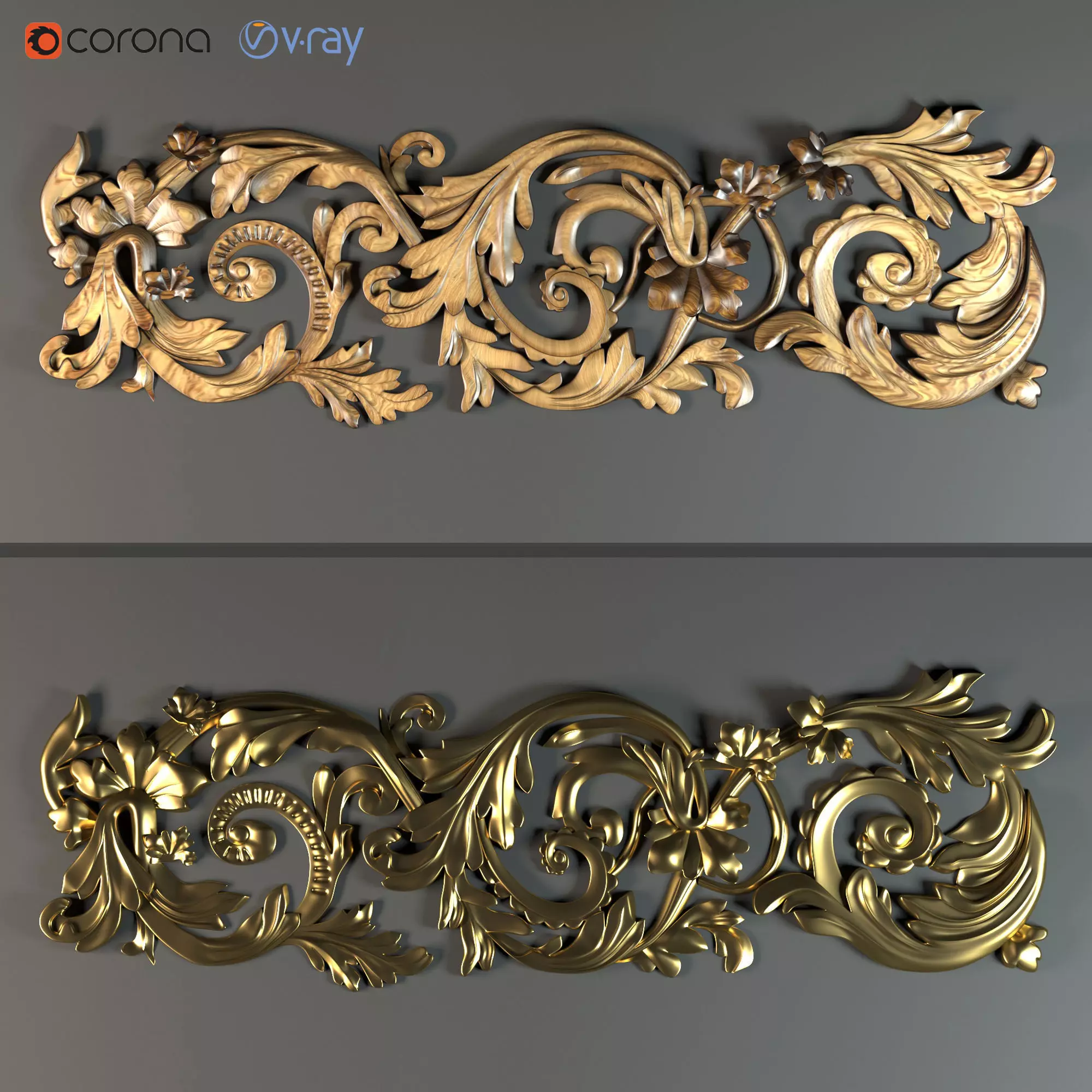 ** The object is available in two different materials, gold and wood.** Turbosmooth modifier is not collaped and it is recommended to set Interations to 3.** Number of Polys: 10337, Verts: 11522 (without Turbosmooth being applied).