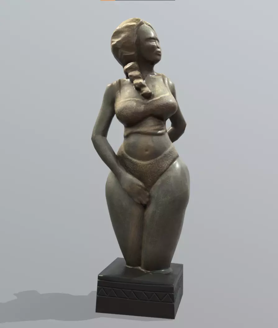 The stone sculpture depict a stylized female figure standing on a rectangular pedestal. The figure has a pronounced, curvaceous form with exaggerated hips and a detailed braid of hair falling over her shoulder. She is adorned in what looks like a textured bikini or undergarments, with intricate patterns etched into the stone. The pedestal is decorated with geometric patterns, adding to the overall artistic detailing of the piece. The figure's posture, with one hand on her hip and the other resting near her thigh, conveys a sense of confidence and poise.