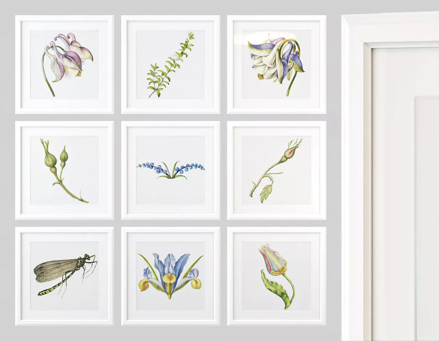 A set of paintings with vintage illustrations of flowers in white square frames Ikea with passepartout.