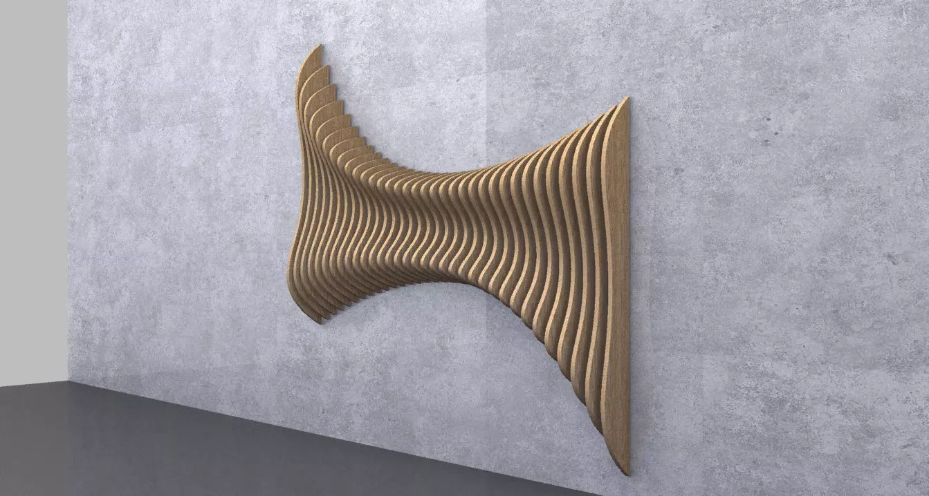 Parametric wavy wooden panels can be used in interior places. Parametric design on wood panels. There are notches on backside of panels to assembly. You can download both 3D model files and 2D cutting files.