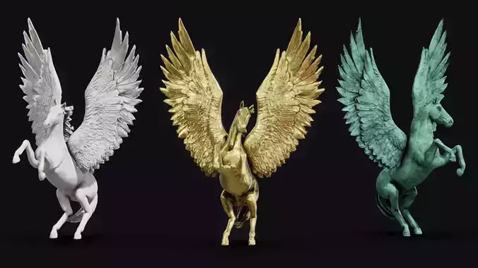 Pegasus (Ancient Greek: Πήγασος, romanized: Pḗgasos; Latin: Pegasus, Pegasos) is a winged horse in Greek mythology, usually depicted as a white stallion. He was sired by Poseidon, in his role as horse-god, and foaled by the Gorgon Medusa. Pegasus was the brother of Chrysaor, both born from Medusa's blood when their mother was decapitated by Perseus. Greco-Roman poets wrote about his ascent to heaven after his birth and his obeisance to Zeus, who instructed him to bring lightning and thunder from Olympus.