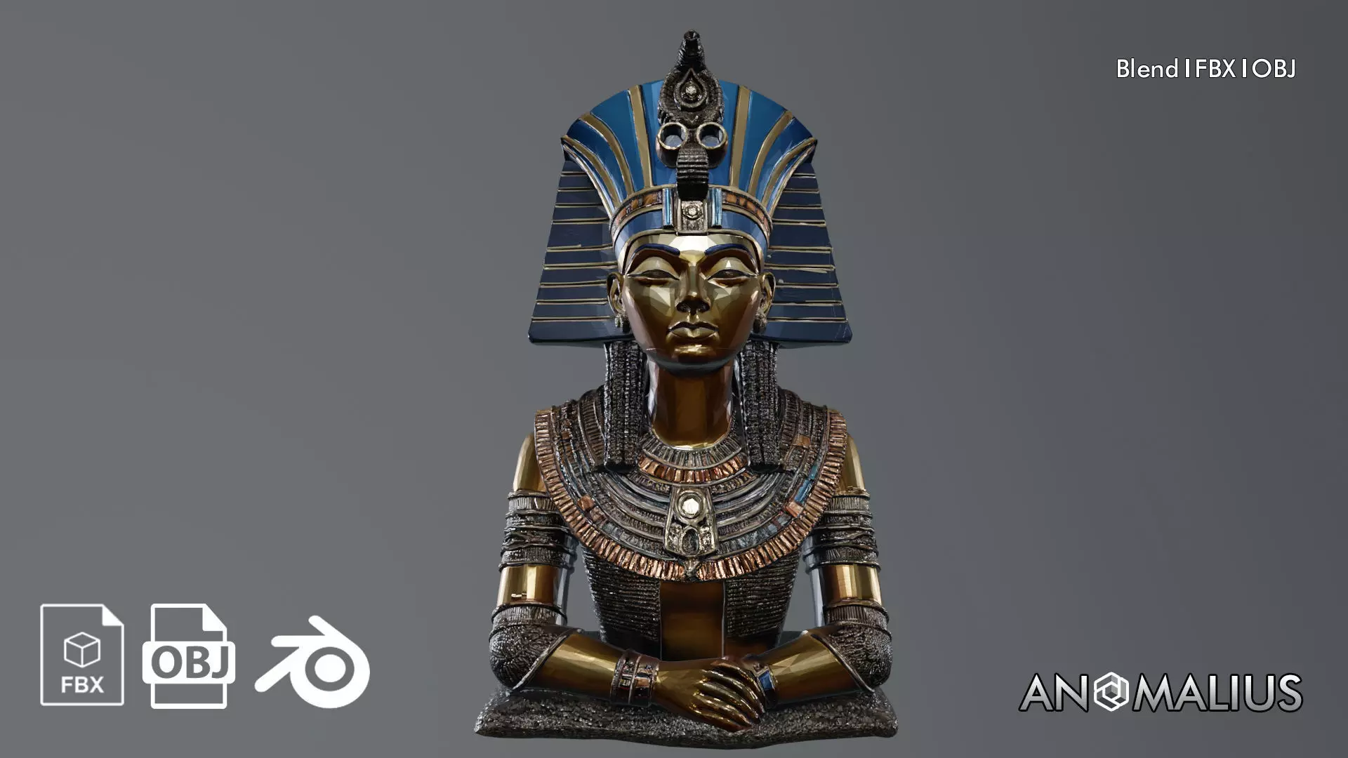 bust of an ancient Egyptian pharaoh or queen, featuring ornate headdress, jewelry, and polished metallic materials. Inspired by classical Egyptian art, this model captures the iconic regal and divine aesthetic of ancient royalty.