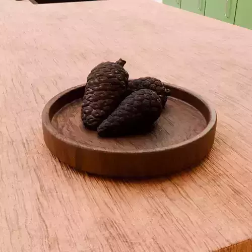 This 3D model features a small decorative arrangement consisting of two pine cone–like natural elements placed on a shallow wooden tray. Designed as a versatile prop asset, it is ideal for enriching interior scenes with subtle, organic detail.