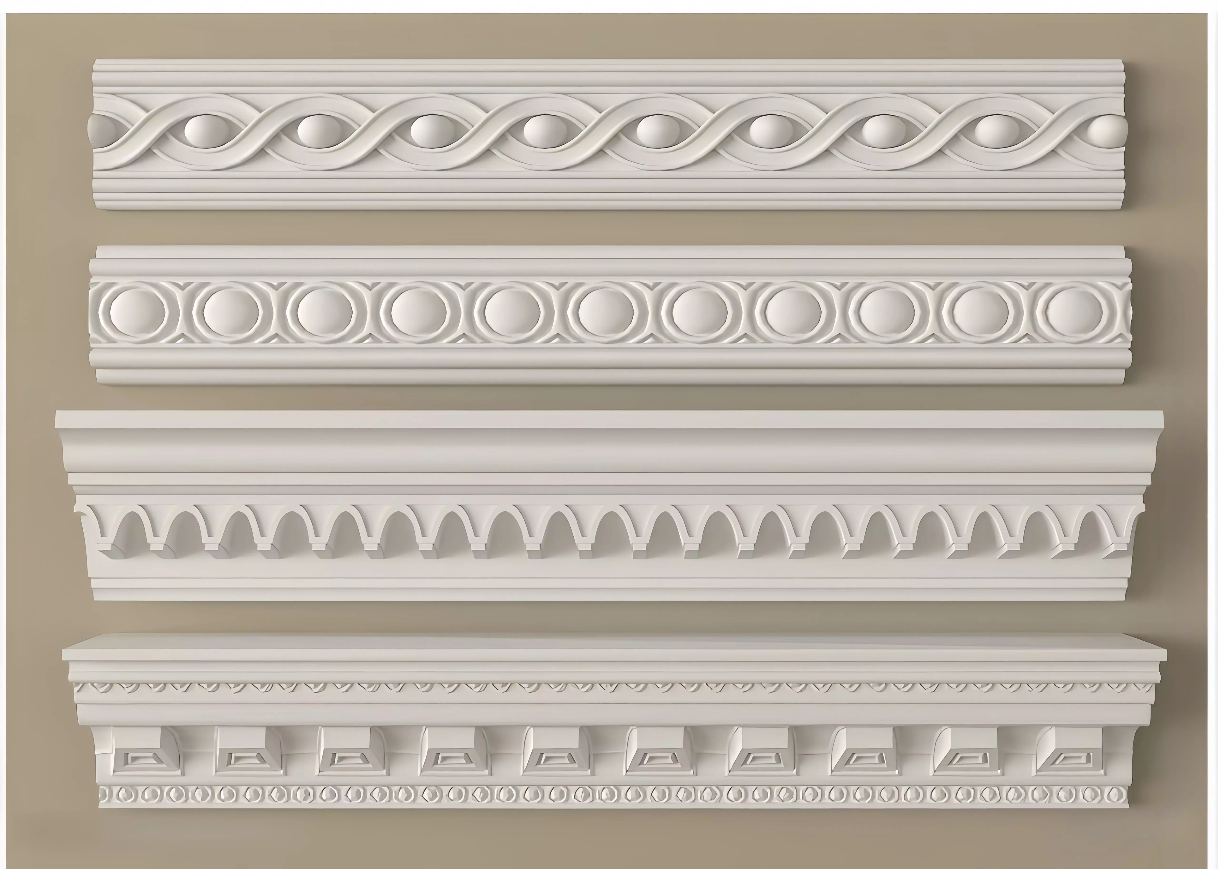 This is a set of white decorative mouldings (plaster cornices / crown mouldings) in a European classical style, showcasing four distinct relief pattern designs:Top moulding: Features a combination of twisted rope patterns and round beads, presenting continuous wavy intertwining with circular accents, creating a strong sense of rhythm.Second moulding: Centered around continuous circular reliefs, it is simple, neat, and visually clean and crisp.Third moulding: Adorned with pointed arch-shaped small arches (dentil arches), a typical classical architectural decorative element with clear layering.Bottom moulding: Integrates square corbels, beaded patterns, and small dentil patterns. It boasts rich layers and enhanced decorative appeal, making it ideal for use as a cornice or chair rail.These mouldings are commonly used for interior ceiling edges, wall borders, door/window frames, or building facades, serving to beautify boundaries and elevate the space's elegance and classical ambiance. They are primarily made of plaster or PU, predominantly in white, and can be finished with paint.