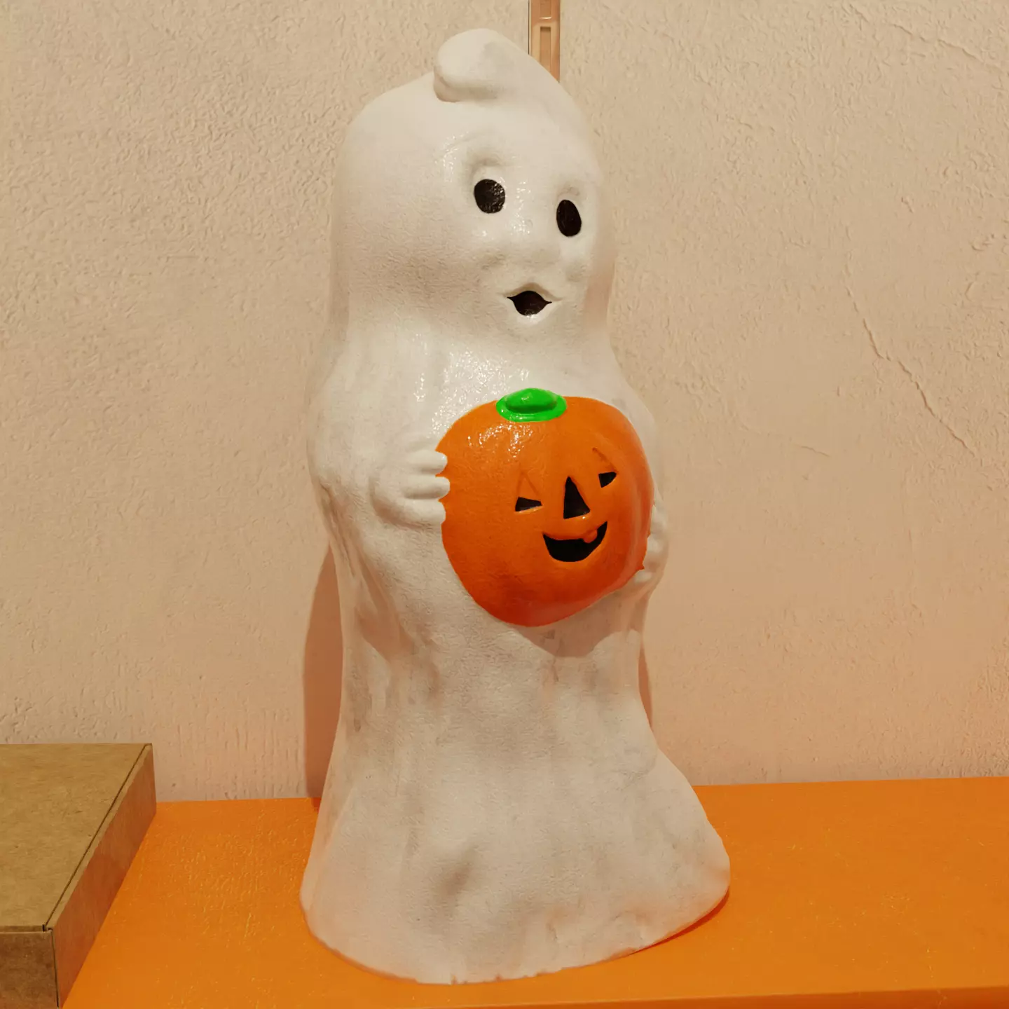Halloween plastic blow mold of a ghost holding a pumpkin.