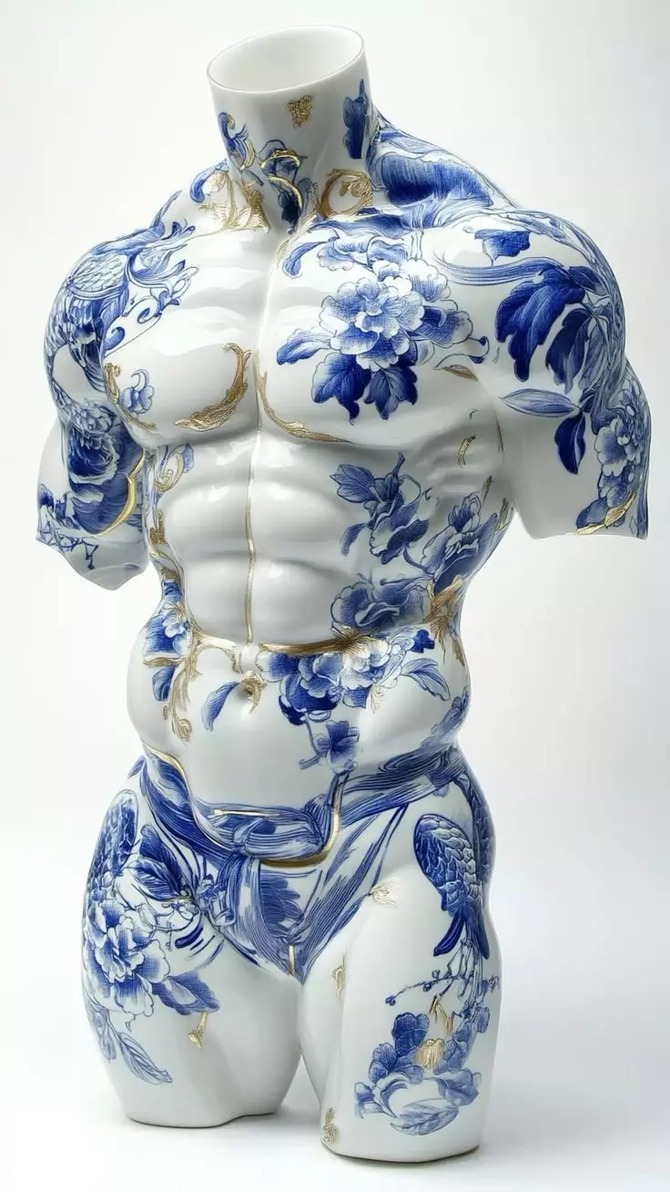 Exquisite 3D model of a surreal and artistic porcelain sculpture shaped like a highly muscular male torso, seamlessly blending classical Chinese blue-and-white ceramic design with modern anatomical form. The figure is crafted from glossy white porcelain, adorned with intricate hand-painted cobalt blue floral patterns—featuring peonies, lotus blossoms, leaves, and swirling vines—inspired by traditional Ming and Qing dynasty ceramics. Delicate gold accents highlight the contours of the muscles, joints, and decorative elements, adding a touch of luxury and refinement. The piece stands as a striking fusion of art, culture, and surrealism, transforming the human form into a functional yet symbolic vessel—a vase or decorative object that defies conventional expectations.