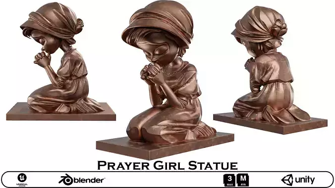 Name: Prayer Girl StatueType: modelFormat: 3Ds Max 2013Export: FBX, OBJRender: VRay (5.x), Corona (9)Polys: 13173Verts: 13267Matclasses: VRayMtl,_CoronaPhysicalMtlUnits: CentimetersDimension: 89.33 x 49.1 x 99.85Date: 2025.8.25This premium 3D model is a highly detailed and realistic representation of a serene statue of a girl kneeling in prayer. The sculpture is rendered with a beautiful, aged metal texture, giving it the appearance of being crafted from worn bronze or copper with a rich patina. The model captures a peaceful and solemn expression, with realistic clothing folds that add to the overall lifelike quality. This captivating asset is perfect for adding a sense of tranquility, spirituality, and artistic elegance to any scene. High-Quality Sculpt and Textures: The model is created from a high-resolution sculpt, meticulously capturing the detailed forms and the intricate, mottled texture of the aged metal. The PBR (Physically Based Rendering) textures are expertly crafted to provide a photorealistic look, with accurate maps that highlight the worn metallic surface and the beautiful patina.