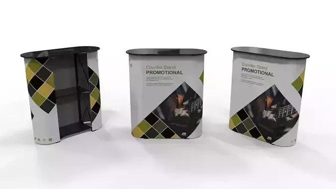 This 3D model represents a promotional pop-up counter stand designed for trade shows, product displays, and customer service points in high-traffic commercial environments. Its structure combines portability, easy assembly, and professional visual impact, making it ideal for use in exhibitions, retail stores, events, and public spaces.